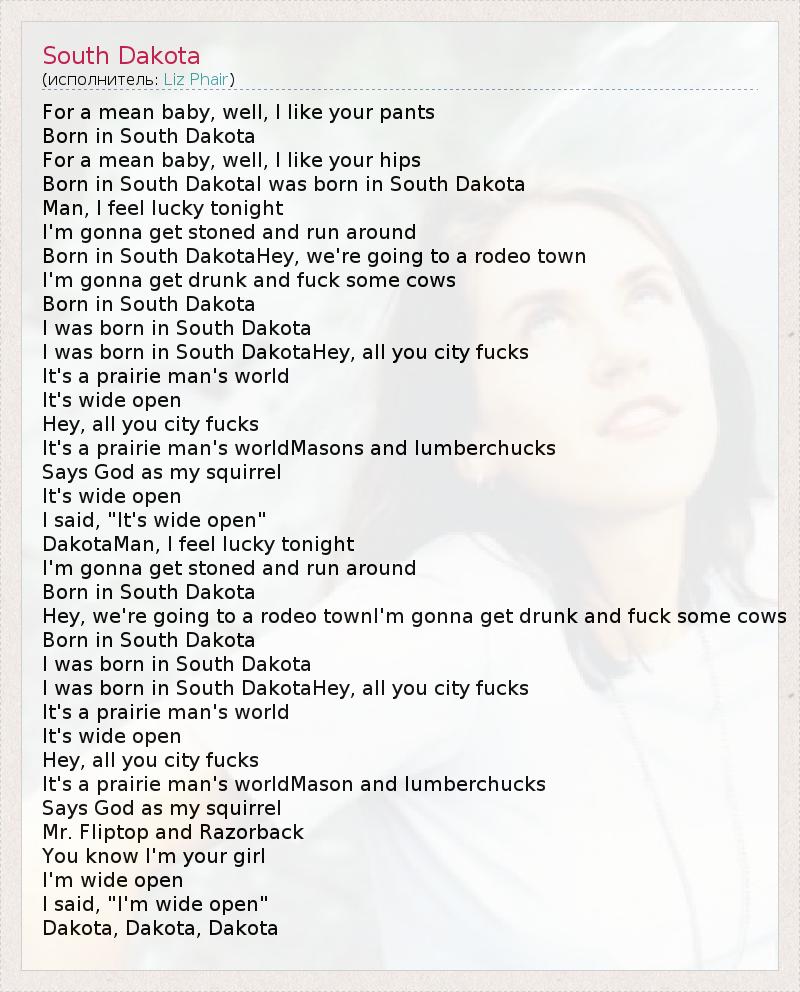 For a mean baby, well, I like your pants Born in South Dakota For a mean baby, well, I like your hips Born in South DakotaI was born in South Dakota Man, I feel lucky tonight I'm gonna get stoned and run around Born in South DakotaHey, we're going to a rodeo town I'm gonna get drunk and fuck some cows Born in South Dakota I was born in South Dakota I was born in South DakotaHey, all you city fucks It's a prairie man's world It's wide open Hey, all you city fucks It's a prairie man's worldMasons and lumberchucks Says God as my squirrel It's wide open I said, "It's wide open" DakotaMan, I feel lucky tonight I'm gonna get stoned and run around Born in South Dakota Hey, we're going to a rodeo townI'm gonna get drunk and fuck some cows Born in South Dakota I was born in South Dakota I was born in South DakotaHey, all you city fucks It's a prairie man's world It's wide open Hey, all you city fucks It's a prairie man's worldMason and lumberchucks Says God as my squirrel Mr. Fliptop and Razorback You know I'm your girl I'm wide open I said, "I'm wide open" Dakota, Dakota, Dakota