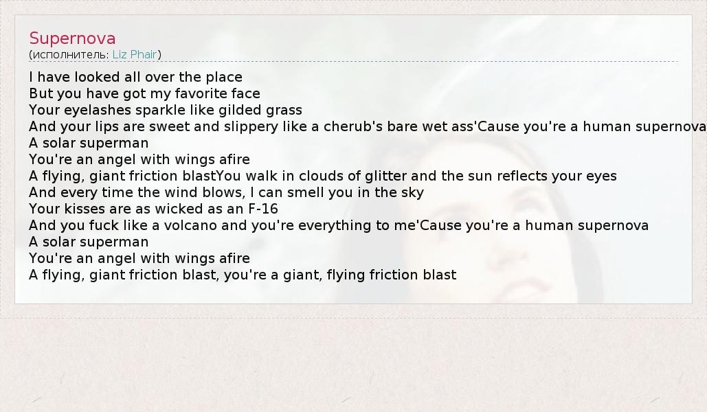 And your lips are sweet and slippery like a cherub's bare wet ass'Cause you're a human supernova