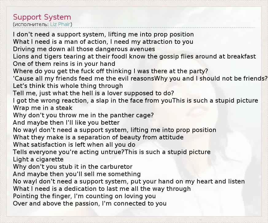 I don't need a support system, lifting me into prop position What I need is a man of action, I need my attraction to you Driving me down all those dangerous avenues Lions and tigers tearing at their foodI know the gossip flies around at breakfast One of them reins is in your hand Where do you get the fuck off thinking I was there at the party? 'Cause all my friends feed me the evil reasonsWhy you and I should not be friends? Let's think this whole thing through Tell me, just what the hell is a lover supposed to do? I got the wrong reaction, a slap in the face from youThis is such a stupid picture Wrap me in a steak Why don't you throw me in the panther cage? And maybe then I'll like you better No wayI don't need a support system, lifting me into prop position What they make is a separation of beauty from attitude What satisfaction is left when all you do Tells everyone you're acting untrue?This is such a stupid picture Light a cigarette Why don't you stub it in the carburetor And maybe then you'll sell me something No wayI don't need a support system, put your hand on my heart and listen What I need is a dedication to last me all the way through Pointing the finger, I'm counting on loving you Over and above the passion, I'm connected to you