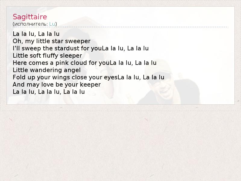 La la lu, La la lu Oh, my little star sweeper I'll sweep the stardust for youLa la lu, La la lu Little soft fluffy sleeper Here comes a pink cloud for youLa la lu, La la lu Little wandering angel Fold up your wings close your eyesLa la lu, La la lu And may love be your keeper La la lu, La la lu, La la lu