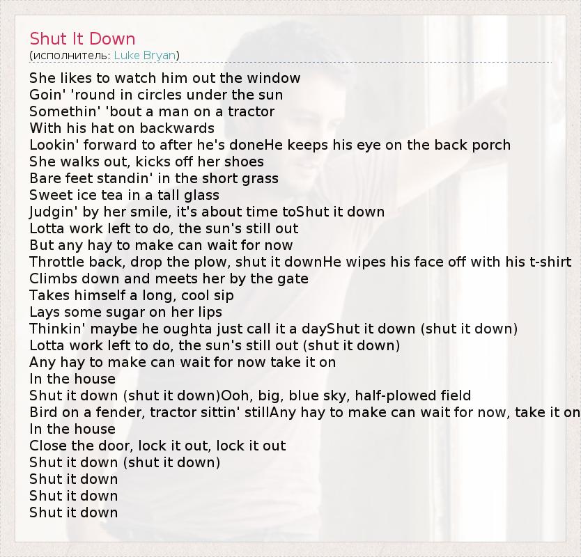 She likes to watch him out the window Goin' 'round in circles under the sun Somethin' 'bout a man on a tractor With his hat on backwards Lookin' forward to after he's doneHe keeps his eye on the back porch She walks out, kicks off her shoes Bare feet standin' in the short grass Sweet ice tea in a tall glass Judgin' by her smile, it's about time toShut it down Lotta work left to do, the sun's still out But any hay to make can wait for now Throttle back, drop the plow, shut it downHe wipes his face off with his t-shirt Climbs down and meets her by the gate Takes himself a long, cool sip Lays some sugar on her lips Thinkin' maybe he oughta just call it a dayShut it down (shut it down) Lotta work left to do, the sun's still out (shut it down) Any hay to make can wait for now take it on In the house Shut it down (shut it down)Ooh, big, blue sky, half-plowed field Bird on a fender, tractor sittin' stillAny hay to make can wait for now, take it on In the house Close the door, lock it out, lock it out Shut it down (shut it down) Shut it down Shut it down Shut it down