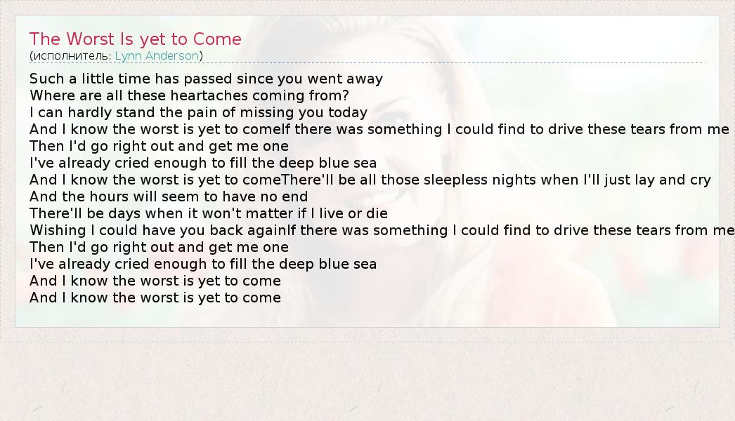 ГлавнаяИсполнителиLynn AndersonThe Worst Is yet to Come