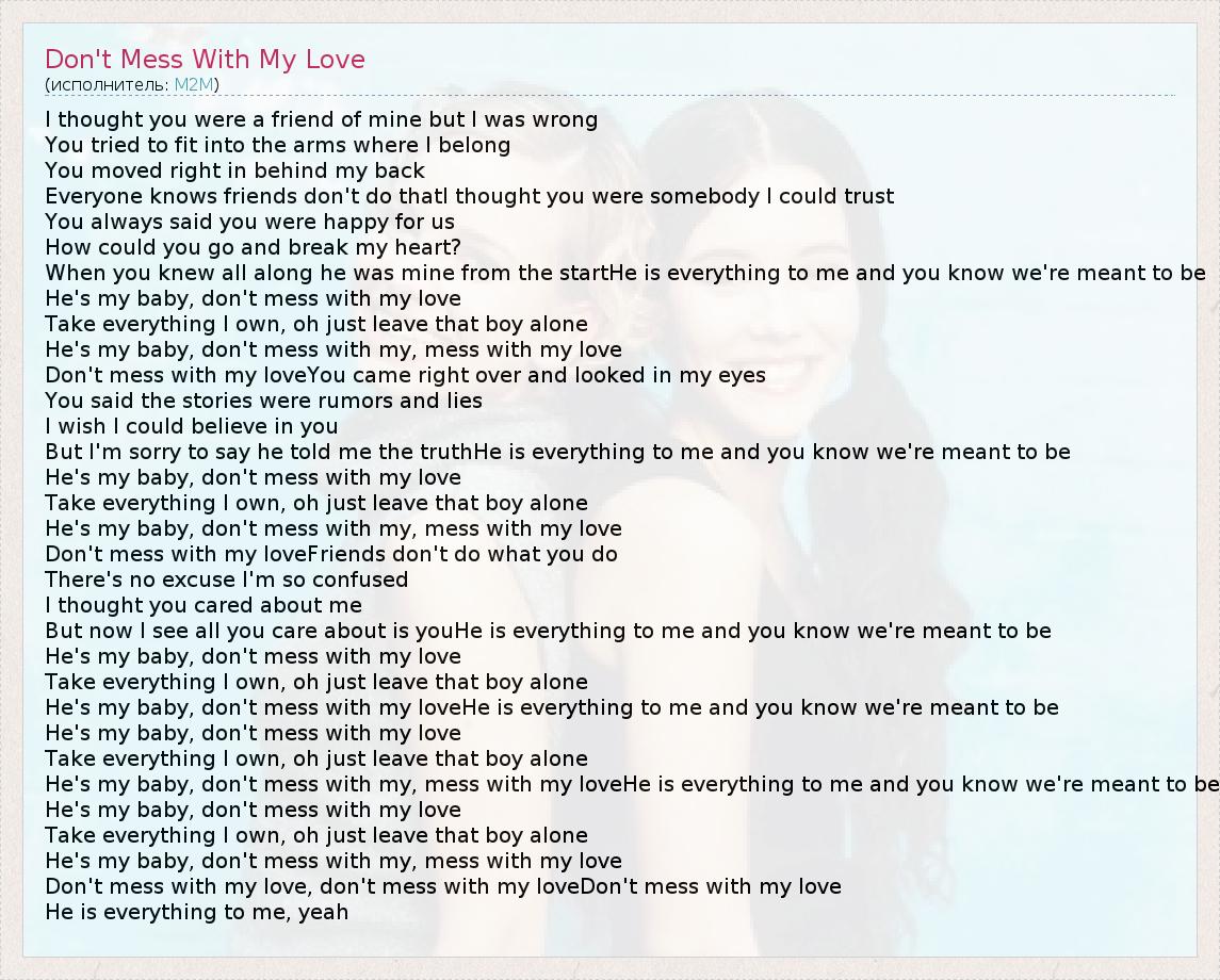 I thought you were a friend of mine but I was wrong You tried to fit into the arms where I belong You moved right in behind my back Everyone knows friends don't do thatI thought you were somebody I could trust You always said you were happy for us How could you go and break my heart? When you knew all along he was mine from the startHe is everything to me and you know we're meant to be He's my baby, don't mess with my love Take everything I own, oh just leave that boy alone He's my baby, don't mess with my, mess with my love Don't mess with my loveYou came right over and looked in my eyes You said the stories were rumors and lies I wish I could believe in you But I'm sorry to say he told me the truthHe is everything to me and you know we're meant to be He's my baby, don't mess with my love Take everything I own, oh just leave that boy alone He's my baby, don't mess with my, mess with my love Don't mess with my loveFriends don't do what you do There's no excuse I'm so confused I thought you cared about me But now I see all you care about is youHe is everything to me and you know we're meant to be He's my baby, don't mess with my love Take everything I own, oh just leave that boy alone He's my baby, don't mess with my loveHe is everything to me and you know we're meant to be He's my baby, don't mess with my love Take everything I own, oh just leave that boy alone He's my baby, don't mess with my, mess with my loveHe is everything to me and you know we're meant to be He's my baby, don't mess with my love Take everything I own, oh just leave that boy alone He's my baby, don't mess with my, mess with my love Don't mess with my love, don't mess with my loveDon't mess with my love He is everything to me, yeah