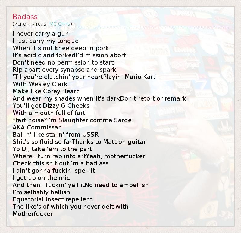 Это интересно:Кристофер Брендан Ворд IV, более известный как mc chris (заглавные буквы необязательны), рэпер и юморист-импровизатор родился 2 сентября, 1975, в Либертивилль, штат Иллинойс. Его отличительные черты - синтез таких образов как geek (на русский это примерно переводится как "ботаник, интересующийся компьютерами") и традиционного гангста имиджа, присущего многим хип-хоп исполнителям, а также высота... продолжение