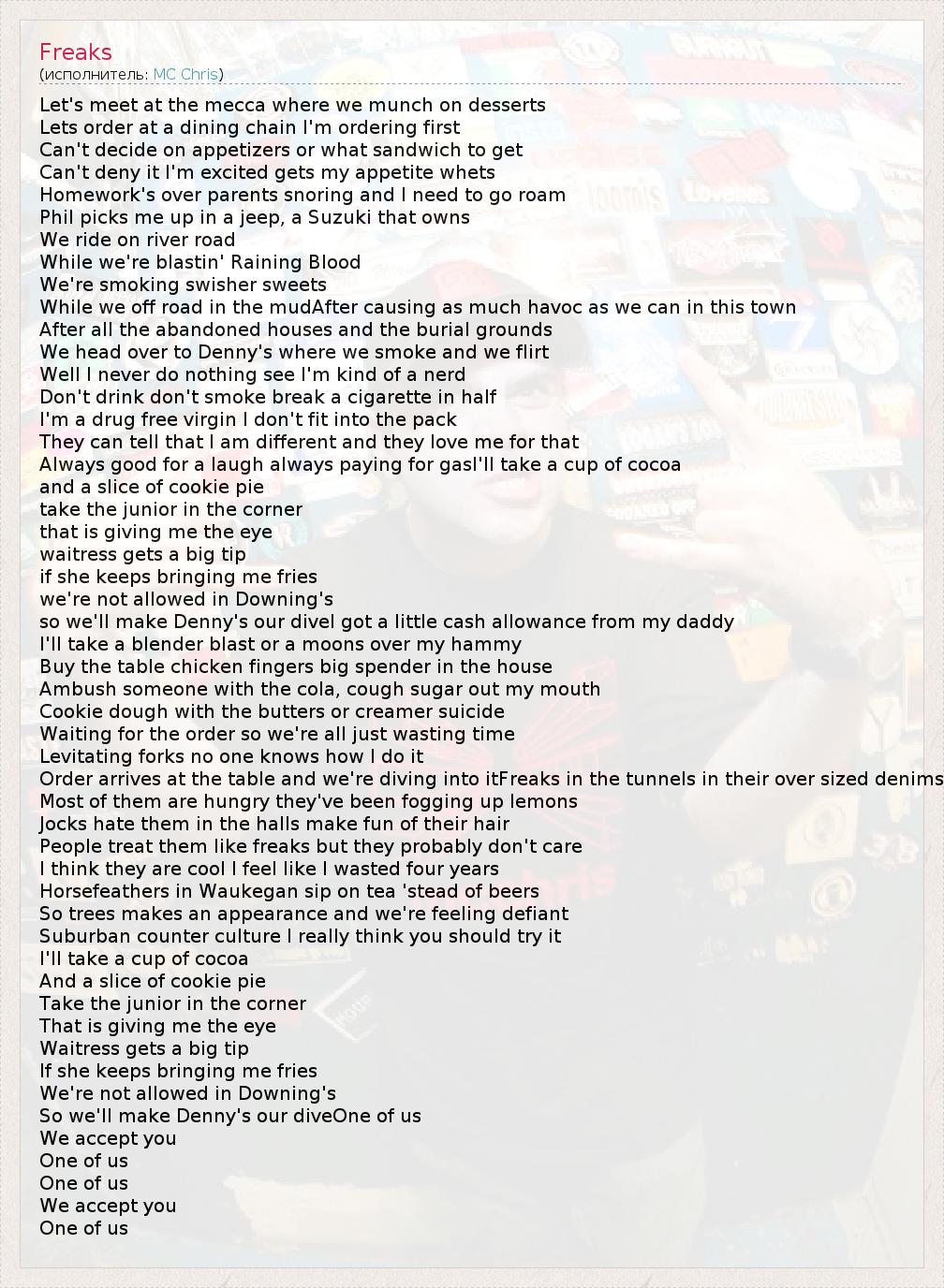 Это интересно:Кристофер Брендан Ворд IV, более известный как mc chris (заглавные буквы необязательны), рэпер и юморист-импровизатор родился 2 сентября, 1975, в Либертивилль, штат Иллинойс. Его отличительные черты - синтез таких образов как geek (на русский это примерно переводится как "ботаник, интересующийся компьютерами") и традиционного гангста имиджа, присущего многим хип-хоп исполнителям, а также высота... продолжение