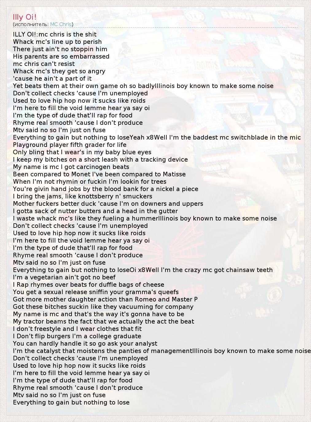 ILLY OI!:mc chris is the shit Whack mc's line up to perish There just ain't no stoppin him His parents are so embarrassed mc chris can't resist Whack mc's they get so angry 'cause he ain't a part of it Yet beats them at their own game oh so badlyIllinois boy known to make some noise Don't collect checks 'cause I'm unemployed Used to love hip hop now it sucks like roids I'm here to fill the void lemme hear ya say oi I'm the type of dude that'll rap for food Rhyme real smooth 'cause I don't produce Mtv said no so I'm just on fuse Everything to gain but nothing to loseYeah x8Well I'm the baddest mc switchblade in the mic Playground player fifth grader for life Only bling that I wear's in my baby blue eyes I keep my bitches on a short leash with a tracking device My name is mc I got carcinogen beats Been compared to Monet I've been compared to Matisse When I'm not rhymin or fuckin I'm lookin for trees You're givin hand jobs by the blood bank for a nickel a piece I bring the jams, like knottsberry n' smuckers Mother fuckers better duck 'cause I'm on downers and uppers I gotta sack of nutter butters and a head in the gutter I waste whack mc's like they fueling a hummerIllinois boy known to make some noise Don't collect checks 'cause I'm unemployed Used to love hip hop now it sucks like roids I'm here to fill the void lemme hear ya say oi I'm the type of dude that'll rap for food Rhyme real smooth 'cause I don't produce Mtv said no so I'm just on fuse Everything to gain but nothing to loseOi x8Well I'm the crazy mc got chainsaw teeth I'm a vegetarian ain't got no beef I Rap rhymes over beats for duffle bags of cheese You get a sexual release sniffin your gramma's queefs Got more mother daughter action than Romeo and Master P Got these bitches suckin like they vacuuming for company My name is mc and that's the way it's gonna have to be My tractor beams the fact that we actually the act the beat I don't freestyle and I wear clothes that fit I Don't flip burgers I'm a college graduate You can hardly handle it so go ask your analyst I'm the catalyst that moistens the panties of managementIllinois boy known to make some noise Don't collect checks 'cause I'm unemployed Used to love hip hop now it sucks like roids I'm here to fill the void lemme hear ya say oi I'm the type of dude that'll rap for food Rhyme real smooth 'cause I don't produce Mtv said no so I'm just on fuse Everything to gain but nothing to lose