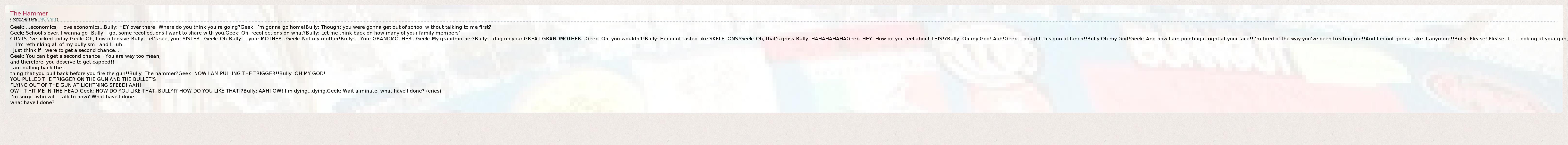 Geek: ...economics, I love economics...Bully: HEY over there! Where do you think you're going?Geek: I'm gonna go home!Bully: Thought you were gonna get out of school without talking to me first? Geek: School's over. I wanna go--Bully: I got some recollections I want to share with you.Geek: Oh, recollections on what?Bully: Let me think back on how many of your family members' CUNTS I've licked today!Geek: Oh, how offensive!Bully: Let's see, your SISTER...Geek: Oh!Bully: ...your MOTHER...Geek: Not my mother!Bully: ...Your GRANDMOTHER...Geek: My grandmother?Bully: I dug up your GREAT GRANDMOTHER...Geek: Oh, you wouldn't!Bully: Her cunt tasted like SKELETONS!Geek: Oh, that's gross!Bully: HAHAHAHAHAGeek: HEY! How do you feel about THIS!?Bully: Oh my God! Aah!Geek: I bought this gun at lunch!!Bully Oh my God!Geek: And now I am pointing it right at your face!!I'm tired of the way you've been treating me!!And I'm not gonna take it anymore!!Bully: Please! Please! I...I...looking at your gun, I...I'm rethinking all of my bullyism...and I...uh... I just think if I were to get a second chance... Geek: You can't get a second chance!! You are way too mean, and therefore, you deserve to get capped!! I am pulling back the... thing that you pull back before you fire the gun!!Bully: The hammer?Geek: NOW I AM PULLING THE TRIGGER!!Bully: OH MY GOD! YOU PULLED THE TRIGGER ON THE GUN AND THE BULLET'S FLYING OUT OF THE GUN AT LIGHTNING SPEED! AAH! OW! IT HIT ME IN THE HEAD!Geek: HOW DO YOU LIKE THAT, BULLY!? HOW DO YOU LIKE THAT!?Bully: AAH! OW! I'm dying...dying.Geek: Wait a minute, what have I done? (cries) I'm sorry...who will I talk to now? What have I done... what have I done?