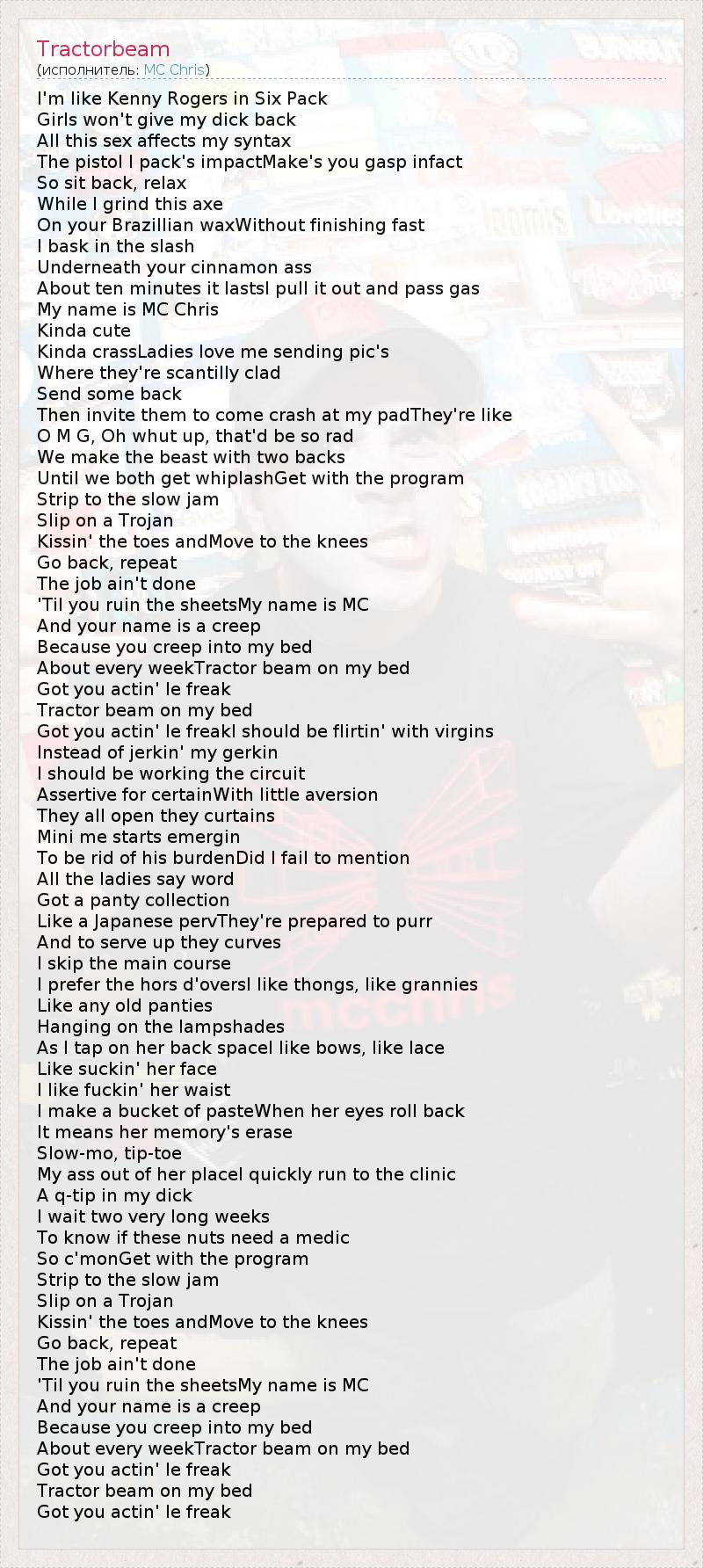 Это интересно:Кристофер Брендан Ворд IV, более известный как mc chris (заглавные буквы необязательны), рэпер и юморист-импровизатор родился 2 сентября, 1975, в Либертивилль, штат Иллинойс. Его отличительные черты - синтез таких образов как geek (на русский это примерно переводится как "ботаник, интересующийся компьютерами") и традиционного гангста имиджа, присущего многим хип-хоп исполнителям, а также высота... продолжение