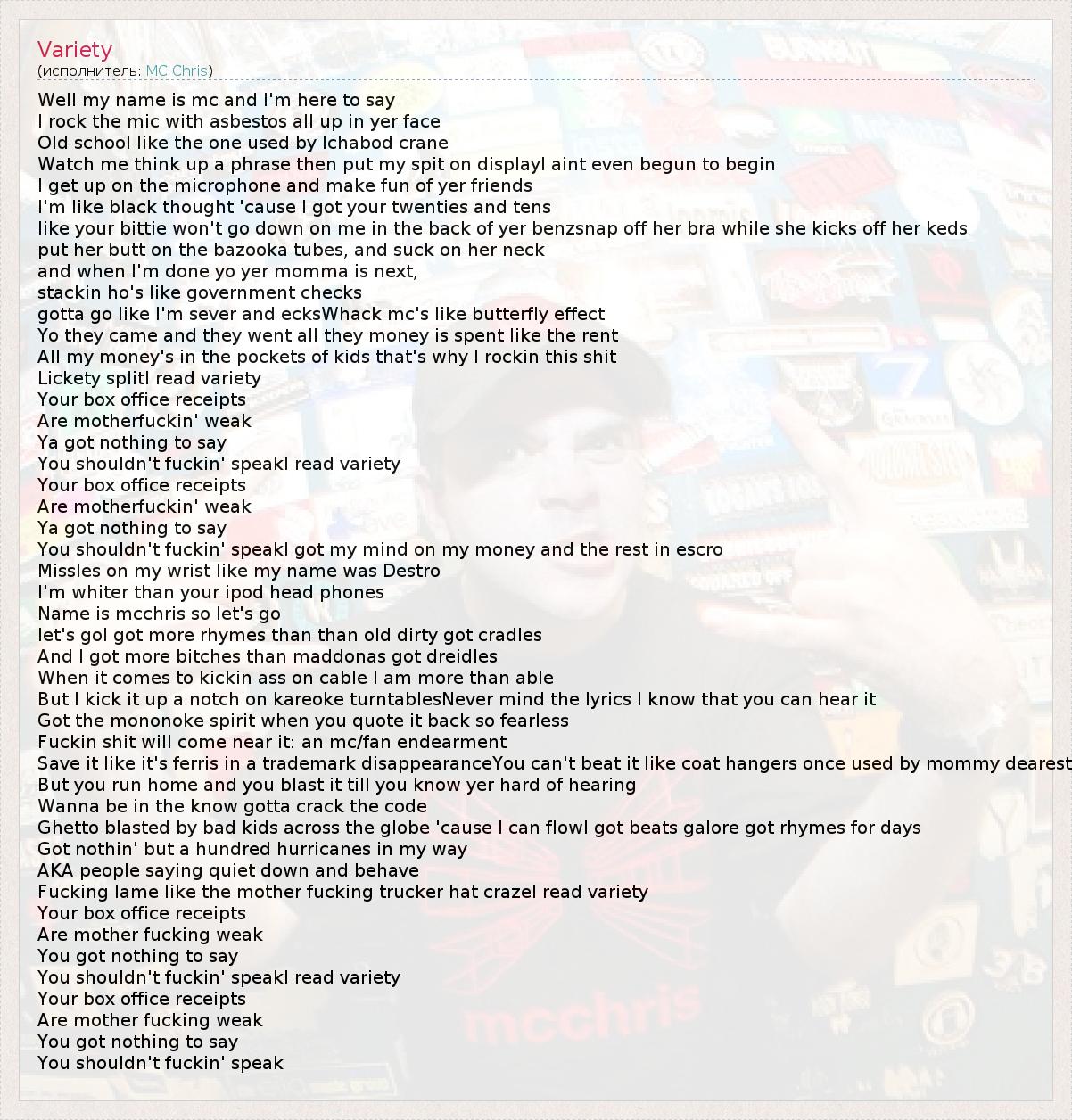 Well my name is mc and I'm here to say I rock the mic with asbestos all up in yer face Old school like the one used by Ichabod crane Watch me think up a phrase then put my spit on displayI aint even begun to begin I get up on the microphone and make fun of yer friends I'm like black thought 'cause I got your twenties and tens like your bittie won't go down on me in the back of yer benzsnap off her bra while she kicks off her keds put her butt on the bazooka tubes, and suck on her neck and when I'm done yo yer momma is next, stackin ho's like government checks gotta go like I'm sever and ecksWhack mc's like butterfly effect Yo they came and they went all they money is spent like the rent All my money's in the pockets of kids that's why I rockin this shit Lickety splitI read variety Your box office receipts Are motherfuckin' weak Ya got nothing to say You shouldn't fuckin' speakI read variety Your box office receipts Are motherfuckin' weak Ya got nothing to say You shouldn't fuckin' speakI got my mind on my money and the rest in escro Missles on my wrist like my name was Destro I'm whiter than your ipod head phones Name is mcchris so let's go let's goI got more rhymes than than old dirty got cradles And I got more bitches than maddonas got dreidles When it comes to kickin ass on cable I am more than able But I kick it up a notch on kareoke turntablesNever mind the lyrics I know that you can hear it Got the mononoke spirit when you quote it back so fearless Fuckin shit will come near it: an mc/fan endearment Save it like it's ferris in a trademark disappearanceYou can't beat it like coat hangers once used by mommy dearest But you run home and you blast it till you know yer hard of hearing Wanna be in the know gotta crack the code Ghetto blasted by bad kids across the globe 'cause I can flowI got beats galore got rhymes for days Got nothin' but a hundred hurricanes in my way AKA people saying quiet down and behave Fucking lame like the mother fucking trucker hat crazeI read variety Your box office receipts Are mother fucking weak You got nothing to say You shouldn't fuckin' speakI read variety Your box office receipts Are mother fucking weak You got nothing to say You shouldn't fuckin' speak