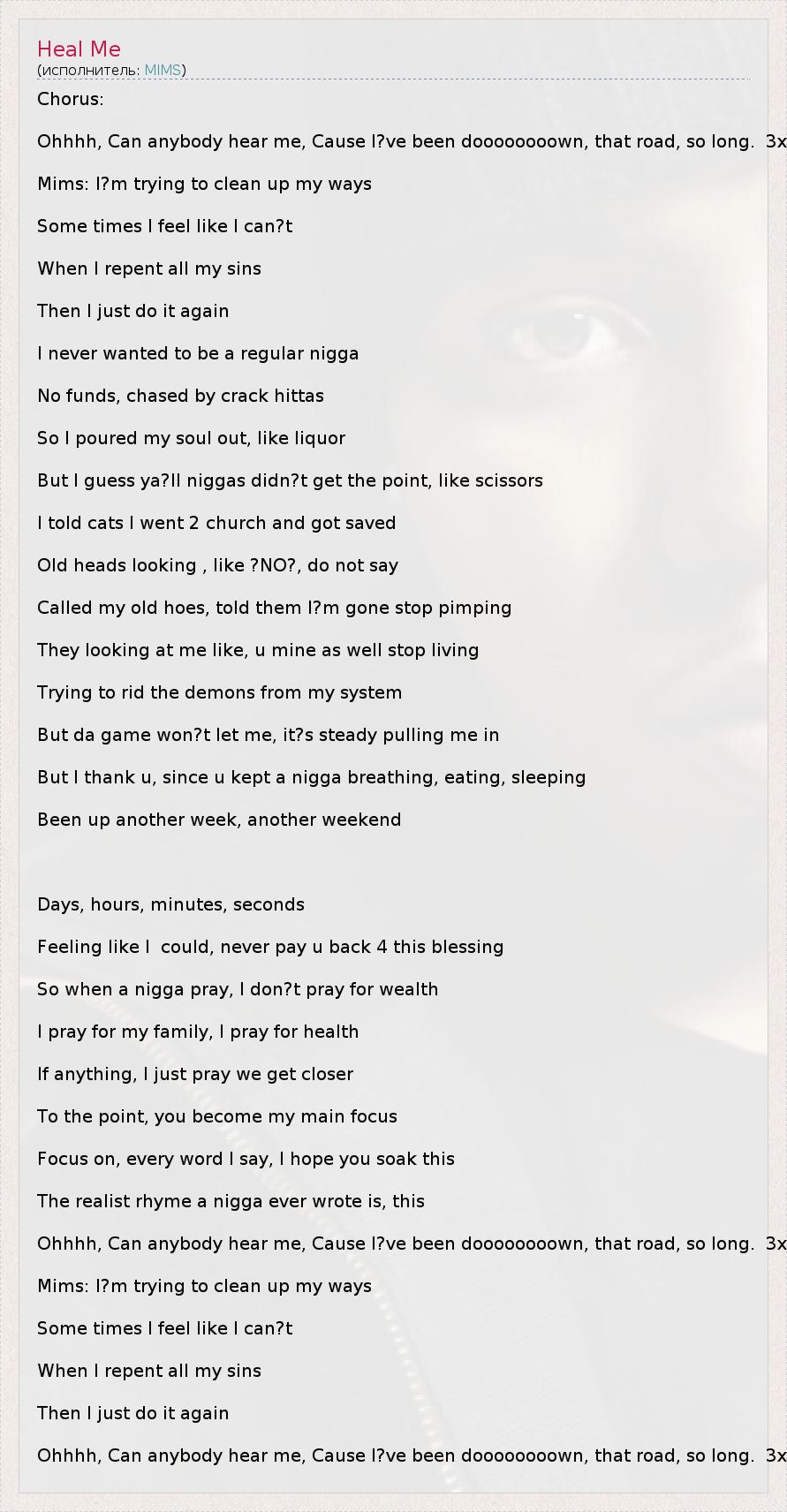 Chorus: Ohhhh, Can anybody hear me, Cause I?ve been doooooooown, that road, so long. 3x Mims: I?m trying to clean up my ways Some times I feel like I can?t When I repent all my sins Then I just do it again I never wanted to be a regular nigga No funds, chased by crack hittas So I poured my soul out, like liquor But I guess ya?ll niggas didn?t get the point, like scissors I told cats I went 2 church and got saved Old heads looking , like ?NO?, do not say Called my old hoes, told them I?m gone stop pimping They looking at me like, u mine as well stop living Trying to rid the demons from my system But da game won?t let me, it?s steady pulling me in But I thank u, since u kept a nigga breathing, eating, sleeping Been up another week, another weekend Days, hours, minutes, seconds Feeling like I could, never pay u back 4 this blessing So when a nigga pray, I don?t pray for wealth I pray for my family, I pray for health If anything, I just pray we get closer To the point, you become my main focus Focus on, every word I say, I hope you soak this The realist rhyme a nigga ever wrote is, this Ohhhh, Can anybody hear me, Cause I?ve been doooooooown, that road, so long. 3x Mims: I?m trying to clean up my ways Some times I feel like I can?t When I repent all my sins Then I just do it again Ohhhh, Can anybody hear me, Cause I?ve been doooooooown, that road, so long. 3x