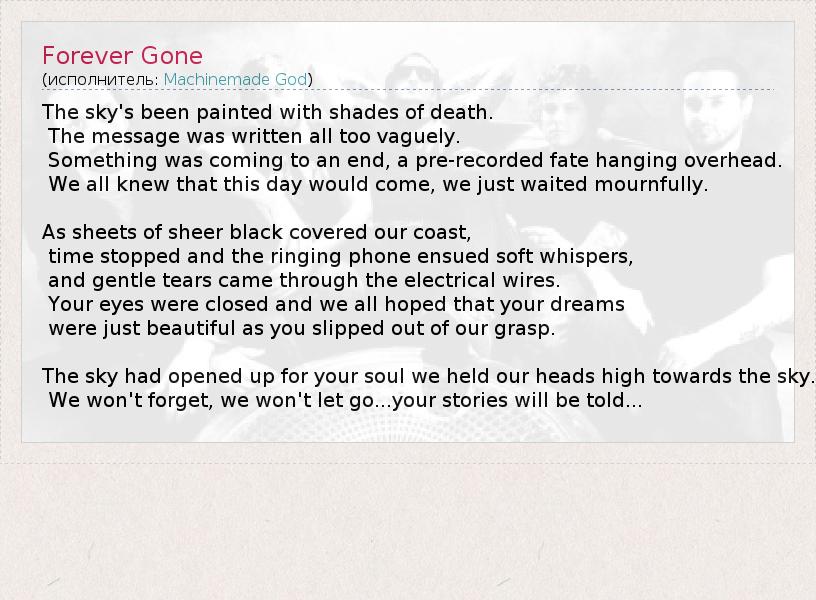 А как ты думаешь, о чем песня "Forever Gone" ?