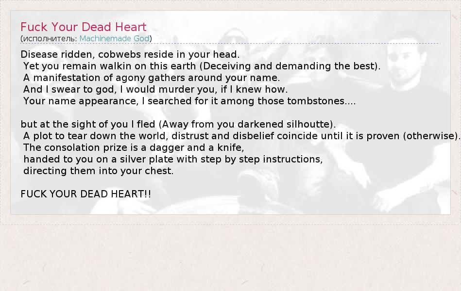 А как ты думаешь, о чем песня "Fuck Your Dead Heart" ?