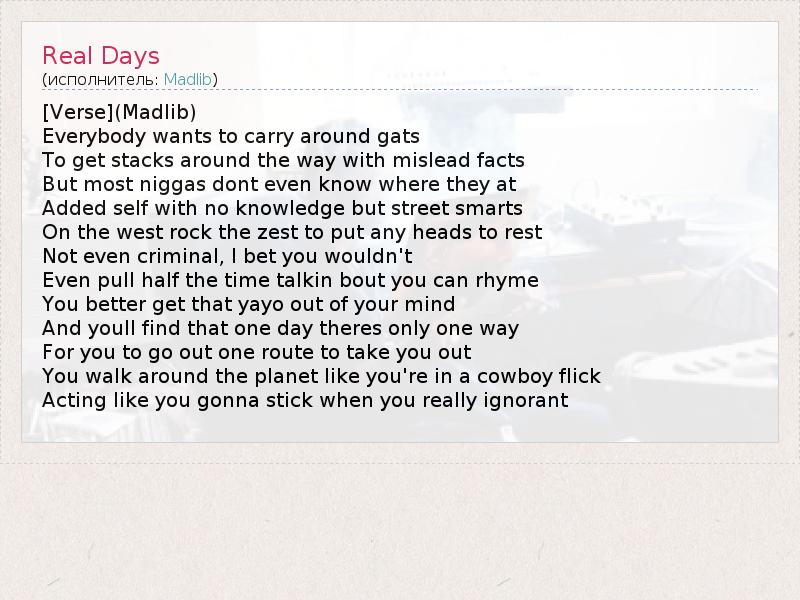 Это интересно:У него много имен, под которыми он издаётся (и лишь одно настоящее - Otis Jackson Jr.). Настоящие любители андеграунда знают, Madlib - парень непростой.Рождённый в г.Окснард, штат Калифорния (Oxnard, CA) сын певца R&B 60-х Отиса Джексона старшего (Otis Jackson Sr.), Madlib своим репертуаром игнорирует простую классификацию. Его первым проектом была широко известная в узких... продолжение
