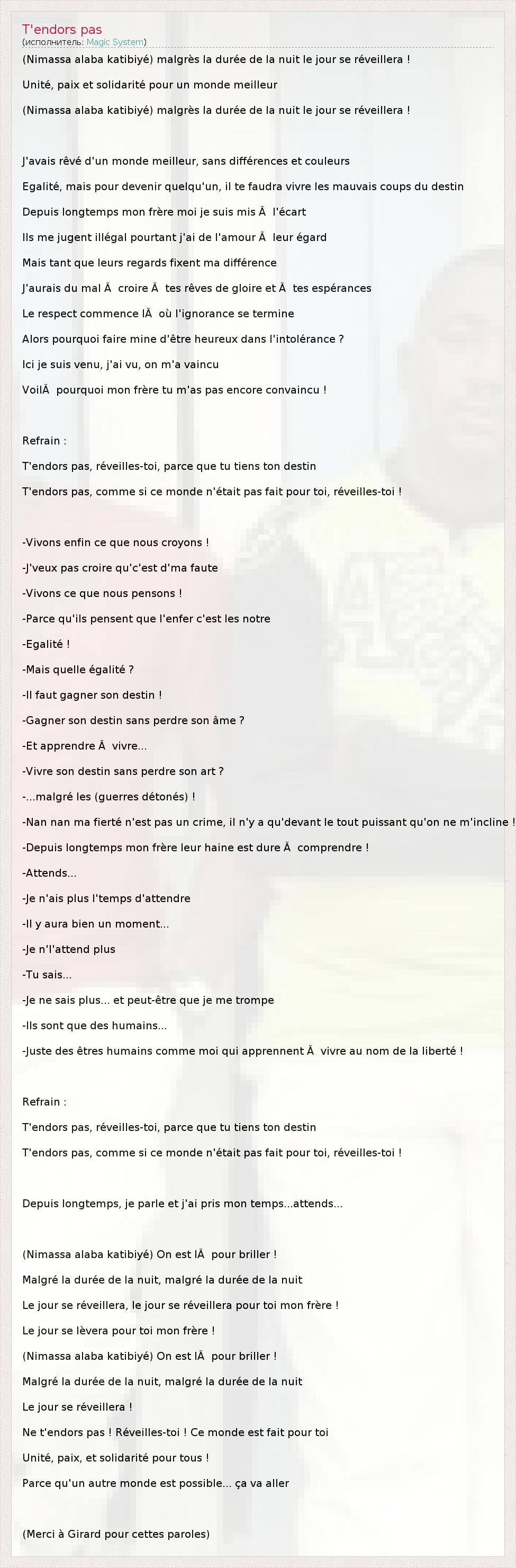 А как ты думаешь, о чем песня "T'endors pas" ?