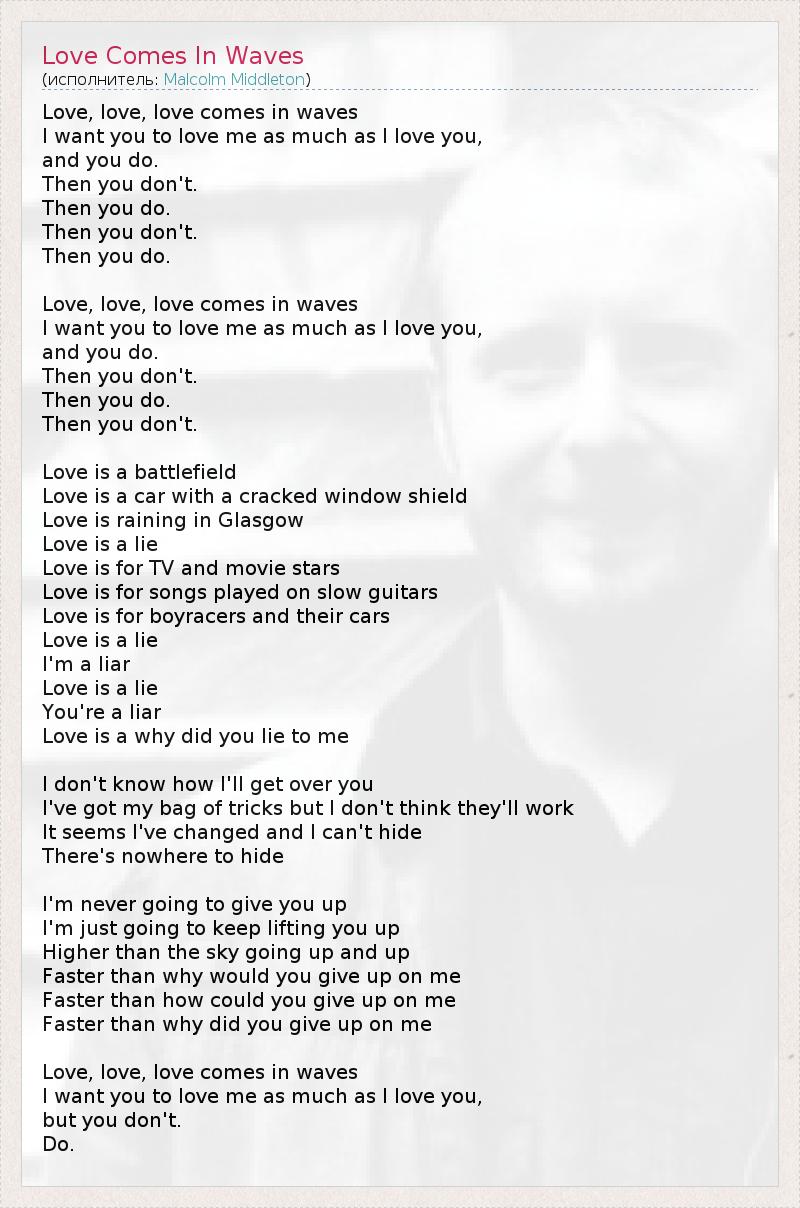Love, love, love comes in waves I want you to love me as much as I love you, and you do. Then you don't. Then you do. Then you don't. Then you do. Love, love, love comes in waves I want you to love me as much as I love you, and you do. Then you don't. Then you do. Then you don't. Love is a battlefield Love is a car with a cracked window shield Love is raining in Glasgow Love is a lie Love is for TV and movie stars Love is for songs played on slow guitars Love is for boyracers and their cars Love is a lie I'm a liar Love is a lie You're a liar Love is a why did you lie to me I don't know how I'll get over you I've got my bag of tricks but I don't think they'll work It seems I've changed and I can't hide There's nowhere to hide I'm never going to give you up I'm just going to keep lifting you up Higher than the sky going up and up Faster than why would you give up on me Faster than how could you give up on me Faster than why did you give up on me Love, love, love comes in waves I want you to love me as much as I love you, but you don't. Do.