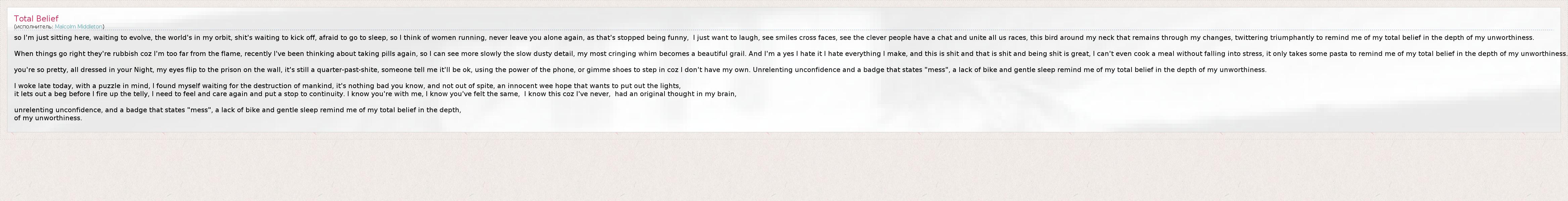 unrelenting unconfidence, and a badge that states "mess", a lack of bike and gentle sleep remind me of my total belief in the depth,