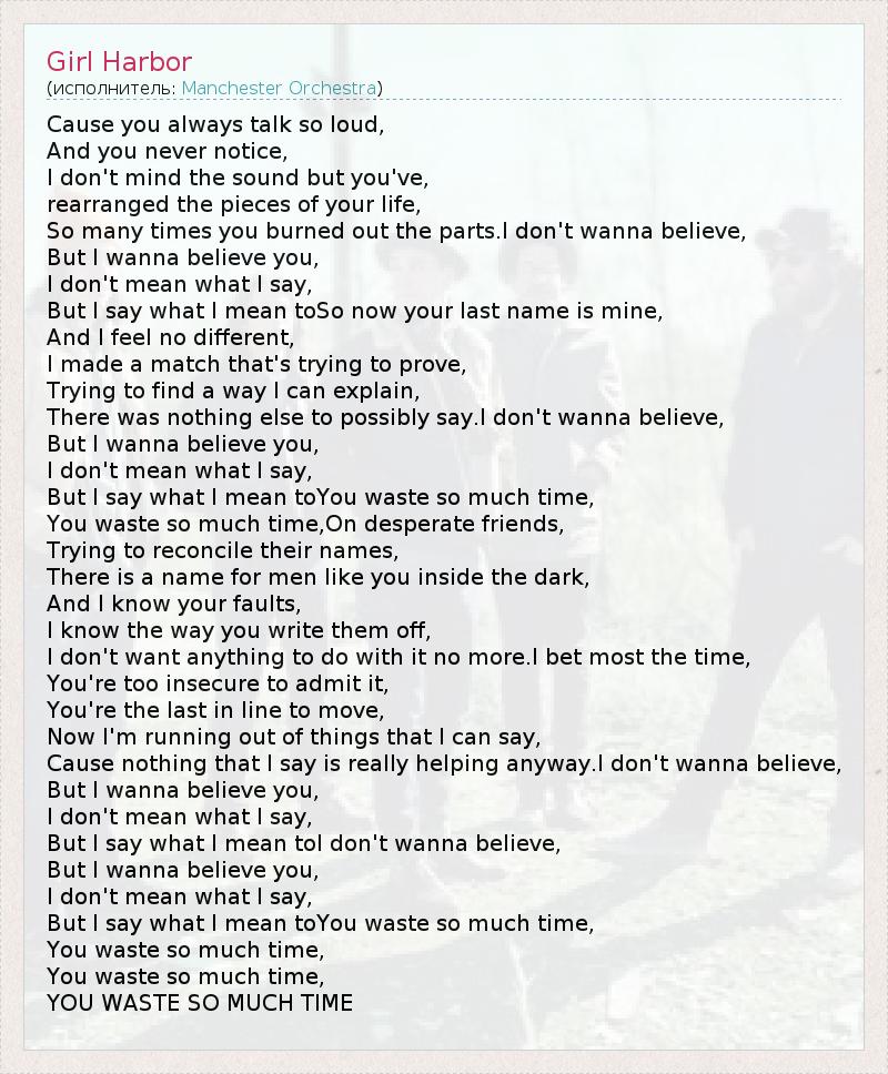 Cause you always talk so loud, And you never notice, I don't mind the sound but you've, rearranged the pieces of your life, So many times you burned out the parts.I don't wanna believe, But I wanna believe you, I don't mean what I say, But I say what I mean toSo now your last name is mine, And I feel no different, I made a match that's trying to prove, Trying to find a way I can explain, There was nothing else to possibly say.I don't wanna believe, But I wanna believe you, I don't mean what I say, But I say what I mean toYou waste so much time, You waste so much time,On desperate friends, Trying to reconcile their names, There is a name for men like you inside the dark, And I know your faults, I know the way you write them off, I don't want anything to do with it no more.I bet most the time, You're too insecure to admit it, You're the last in line to move, Now I'm running out of things that I can say, Cause nothing that I say is really helping anyway.I don't wanna believe, But I wanna believe you, I don't mean what I say, But I say what I mean toI don't wanna believe, But I wanna believe you, I don't mean what I say, But I say what I mean toYou waste so much time, You waste so much time, You waste so much time, YOU WASTE SO MUCH TIME