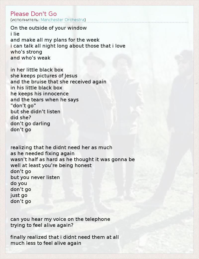 On the outside of your window i lie and make all my plans for the week i can talk all night long about those that i love who's strong and who's weak in her little black box she keeps pictures of Jesus and the bruise that she received again in his little black box he keeps his innocence and the tears when he says "don't go" but she didn't listen did she? don't go darling don't go realizing that he didnt need her as much as he needed fixing again wasn't half as hard as he thought it was gonna be well at least you're being honest don't go but you never listen do you don't go just go don't go can you hear my voice on the telephone trying to feel alive again? finally realized that i didnt need them at all much less to feel alive again