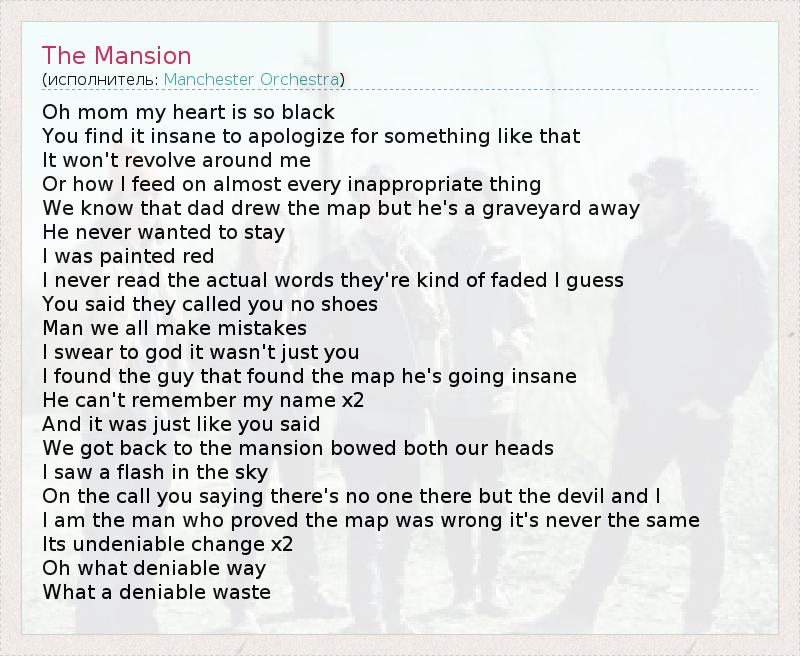 Oh mom my heart is so black You find it insane to apologize for something like that It won't revolve around me Or how I feed on almost every inappropriate thing We know that dad drew the map but he's a graveyard away He never wanted to stay I was painted red I never read the actual words they're kind of faded I guess You said they called you no shoes Man we all make mistakes I swear to god it wasn't just you I found the guy that found the map he's going insane He can't remember my name x2 And it was just like you said We got back to the mansion bowed both our heads I saw a flash in the sky On the call you saying there's no one there but the devil and I I am the man who proved the map was wrong it's never the same Its undeniable change x2 Oh what deniable way What a deniable waste