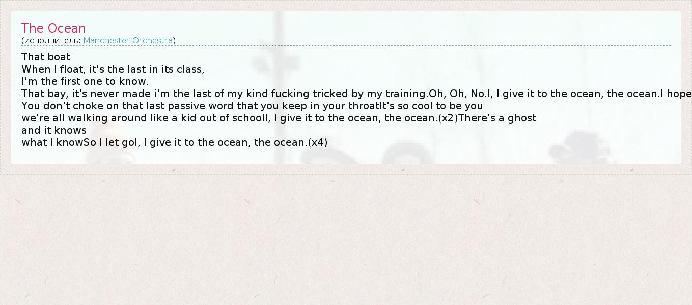 what I knowSo I let goI, I give it to the ocean, the ocean.(x4)