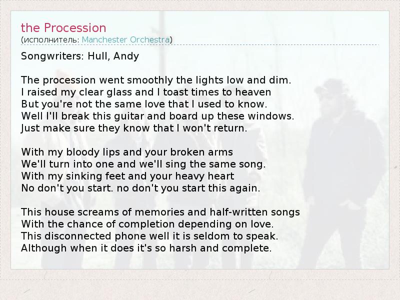 Songwriters: Hull, Andy The procession went smoothly the lights low and dim. I raised my clear glass and I toast times to heaven But you're not the same love that I used to know. Well I'll break this guitar and board up these windows. Just make sure they know that I won't return. With my bloody lips and your broken arms We'll turn into one and we'll sing the same song. With my sinking feet and your heavy heart No don't you start. no don't you start this again. This house screams of memories and half-written songs With the chance of completion depending on love. This disconnected phone well it is seldom to speak. Although when it does it's so harsh and complete.