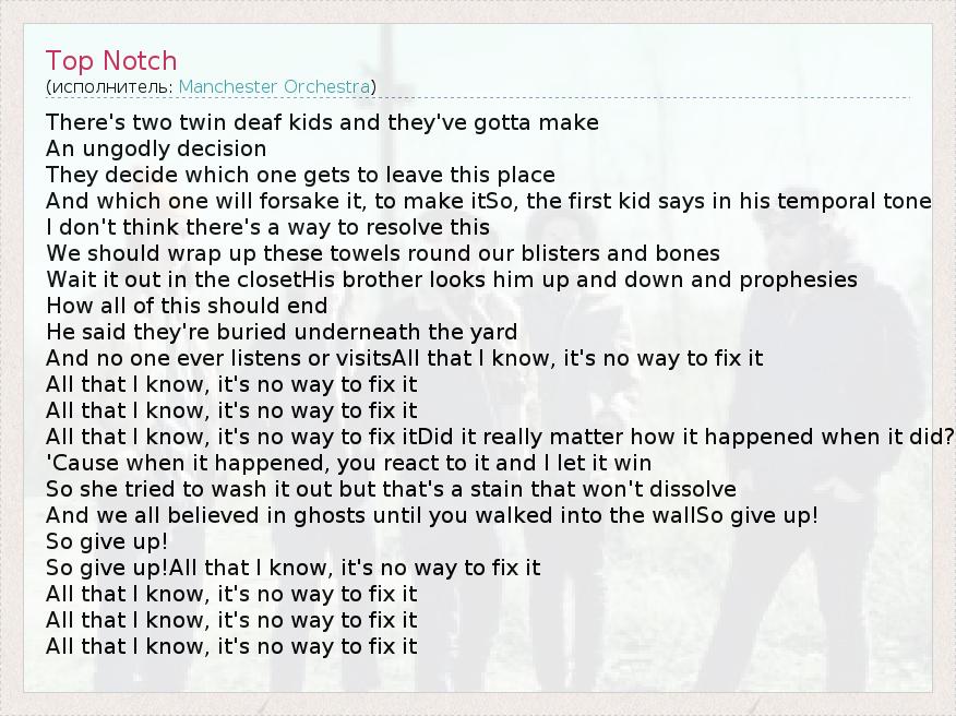There's two twin deaf kids and they've gotta make An ungodly decision They decide which one gets to leave this place And which one will forsake it, to make itSo, the first kid says in his temporal tone I don't think there's a way to resolve this We should wrap up these towels round our blisters and bones Wait it out in the closetHis brother looks him up and down and prophesies How all of this should end He said they're buried underneath the yard And no one ever listens or visitsAll that I know, it's no way to fix it All that I know, it's no way to fix it All that I know, it's no way to fix it All that I know, it's no way to fix itDid it really matter how it happened when it did? 'Cause when it happened, you react to it and I let it win So she tried to wash it out but that's a stain that won't dissolve And we all believed in ghosts until you walked into the wallSo give up! So give up! So give up!All that I know, it's no way to fix it All that I know, it's no way to fix it All that I know, it's no way to fix it All that I know, it's no way to fix it