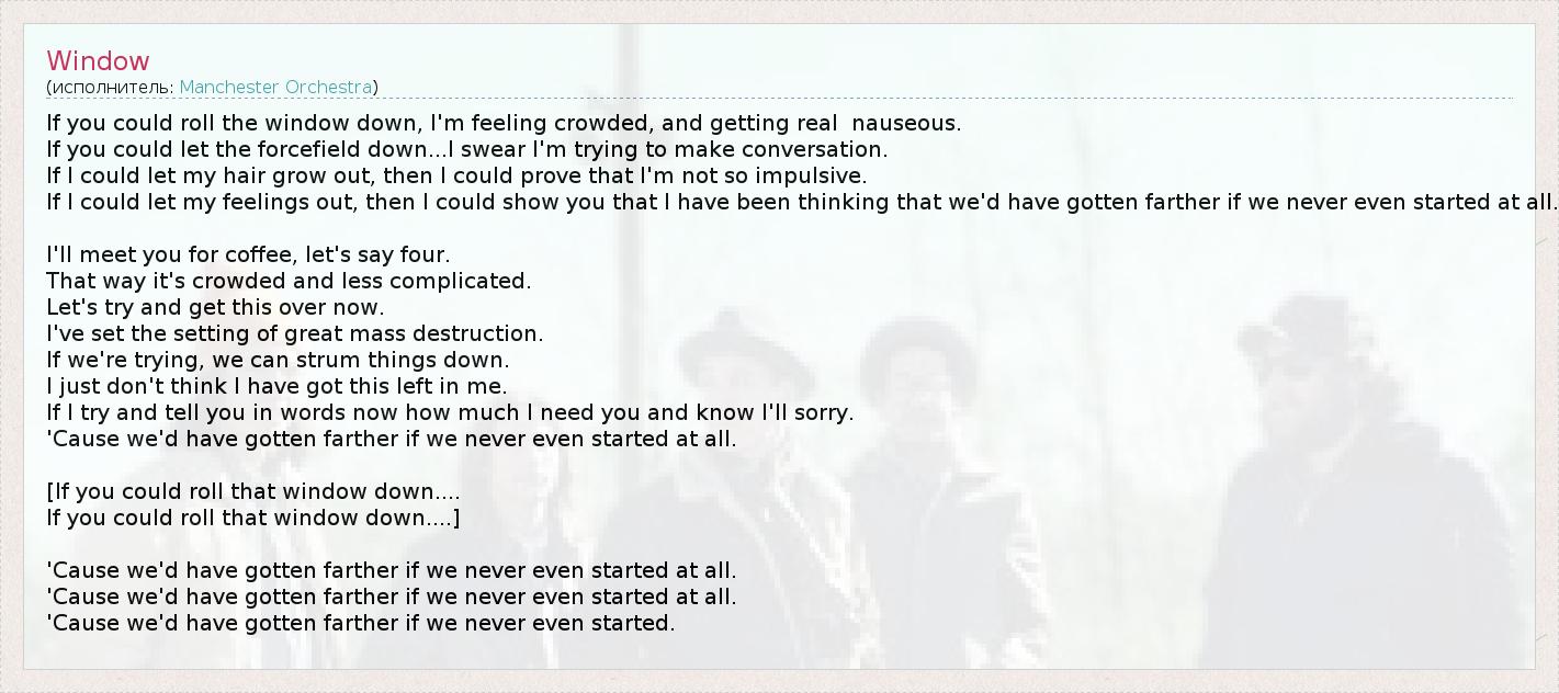 If you could roll the window down, I'm feeling crowded, and getting real nauseous. If you could let the forcefield down...I swear I'm trying to make conversation. If I could let my hair grow out, then I could prove that I'm not so impulsive. If I could let my feelings out, then I could show you that I have been thinking that we'd have gotten farther if we never even started at all. I'll meet you for coffee, let's say four. That way it's crowded and less complicated. Let's try and get this over now. I've set the setting of great mass destruction. If we're trying, we can strum things down. I just don't think I have got this left in me. If I try and tell you in words now how much I need you and know I'll sorry. 'Cause we'd have gotten farther if we never even started at all. [If you could roll that window down.... If you could roll that window down....] 'Cause we'd have gotten farther if we never even started at all. 'Cause we'd have gotten farther if we never even started at all. 'Cause we'd have gotten farther if we never even started.