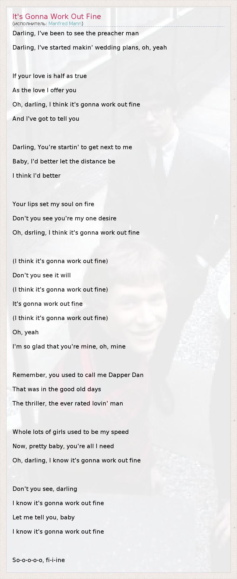 Darling, I've been to see the preacher man Darling, I've started makin' wedding plans, oh, yeah If your love is half as true As the love I offer you Oh, darling, I think it's gonna work out fine And I've got to tell you Darling, You're startin' to get next to me Baby, I'd better let the distance be I think I'd better Your lips set my soul on fire Don't you see you're my one desire Oh, dsrling, I think it's gonna work out fine (I think it's gonna work out fine) Don't you see it will (I think it's gonna work out fine) It's gonna work out fine (I think it's gonna work out fine) Oh, yeah I'm so glad that you're mine, oh, mine Remember, you used to call me Dapper Dan That was in the good old days The thriller, the ever rated lovin' man Whole lots of girls used to be my speed Now, pretty baby, you're all I need Oh, darling, I know it's gonna work out fine Don't you see, darling I know it's gonna work out fine Let me tell you, baby I know it's gonna work out fine So-o-o-o-o, fi-i-ine