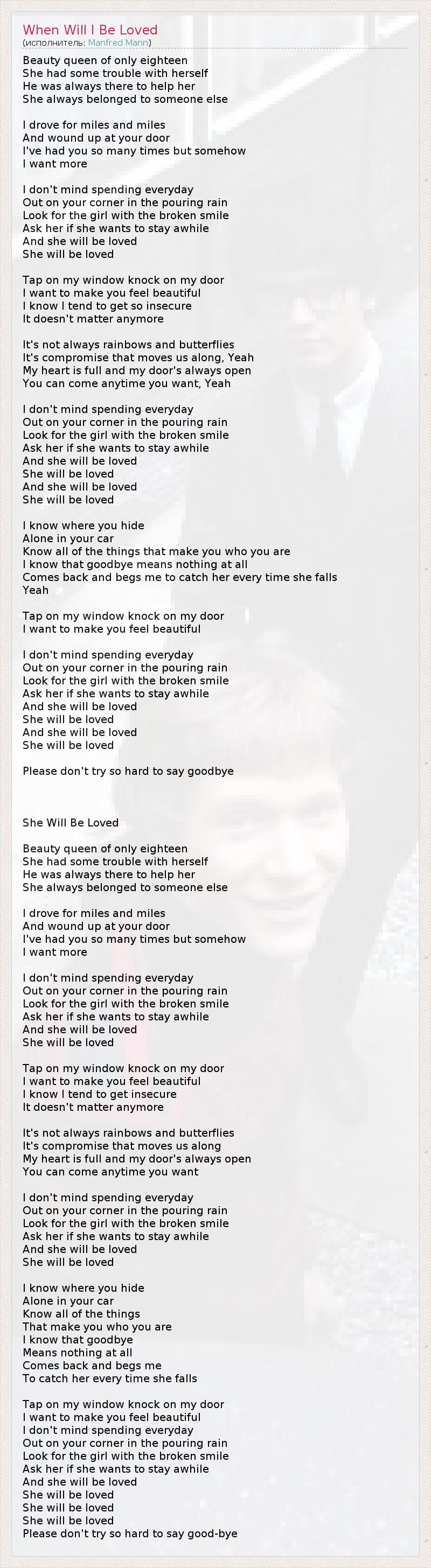 Beauty queen of only eighteen She had some trouble with herself He was always there to help her She always belonged to someone else I drove for miles and miles And wound up at your door I've had you so many times but somehow I want more I don't mind spending everyday Out on your corner in the pouring rain Look for the girl with the broken smile Ask her if she wants to stay awhile And she will be loved She will be loved Tap on my window knock on my door I want to make you feel beautiful I know I tend to get so insecure It doesn't matter anymore It's not always rainbows and butterflies It's compromise that moves us along, Yeah My heart is full and my door's always open You can come anytime you want, Yeah I don't mind spending everyday Out on your corner in the pouring rain Look for the girl with the broken smile Ask her if she wants to stay awhile And she will be loved She will be loved And she will be loved She will be loved I know where you hide Alone in your car Know all of the things that make you who you are I know that goodbye means nothing at all Comes back and begs me to catch her every time she falls Yeah Tap on my window knock on my door I want to make you feel beautiful I don't mind spending everyday Out on your corner in the pouring rain Look for the girl with the broken smile Ask her if she wants to stay awhile And she will be loved She will be loved And she will be loved She will be loved Please don't try so hard to say goodbye She Will Be Loved Beauty queen of only eighteen She had some trouble with herself He was always there to help her She always belonged to someone else I drove for miles and miles And wound up at your door I've had you so many times but somehow I want more I don't mind spending everyday Out on your corner in the pouring rain Look for the girl with the broken smile Ask her if she wants to stay awhile And she will be loved She will be loved Tap on my window knock on my door I want to make you feel beautiful I know I tend to get insecure It doesn't matter anymore It's not always rainbows and butterflies It's compromise that moves us along My heart is full and my door's always open You can come anytime you want I don't mind spending everyday Out on your corner in the pouring rain Look for the girl with the broken smile Ask her if she wants to stay awhile And she will be loved She will be loved I know where you hide Alone in your car Know all of the things That make you who you are I know that goodbye Means nothing at all Comes back and begs me To catch her every time she falls Tap on my window knock on my door I want to make you feel beautiful I don't mind spending everyday Out on your corner in the pouring rain Look for the girl with the broken smile Ask her if she wants to stay awhile And she will be loved She will be loved She will be loved She will be loved Please don't try so hard to say good-bye