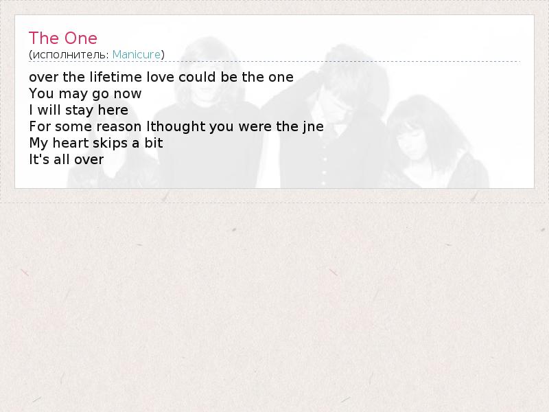 over the lifetime love could be the one You may go now I will stay here For some reason Ithought you were the jne My heart skips a bit It's all over