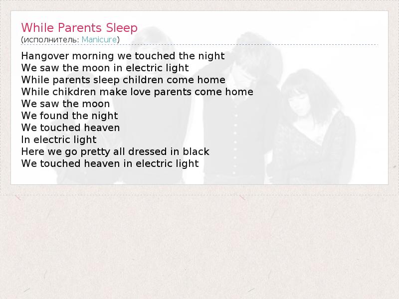 Hangover morning we touched the night We saw the moon in electric light While parents sleep children come home While chikdren make love parents come home We saw the moon We found the night We touched heaven In electric light Here we go pretty all dressed in black We touched heaven in electric light