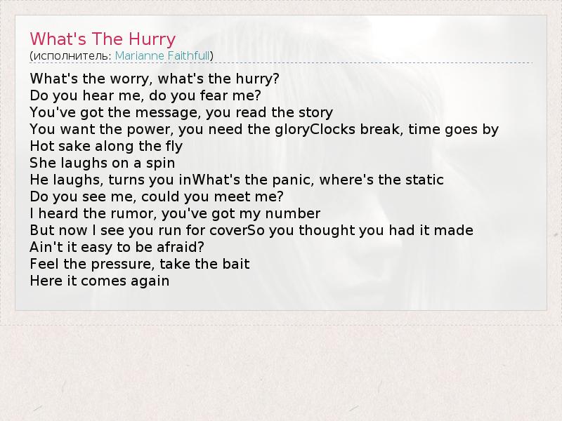 А как ты думаешь, о чем песня "What's The Hurry" ?
