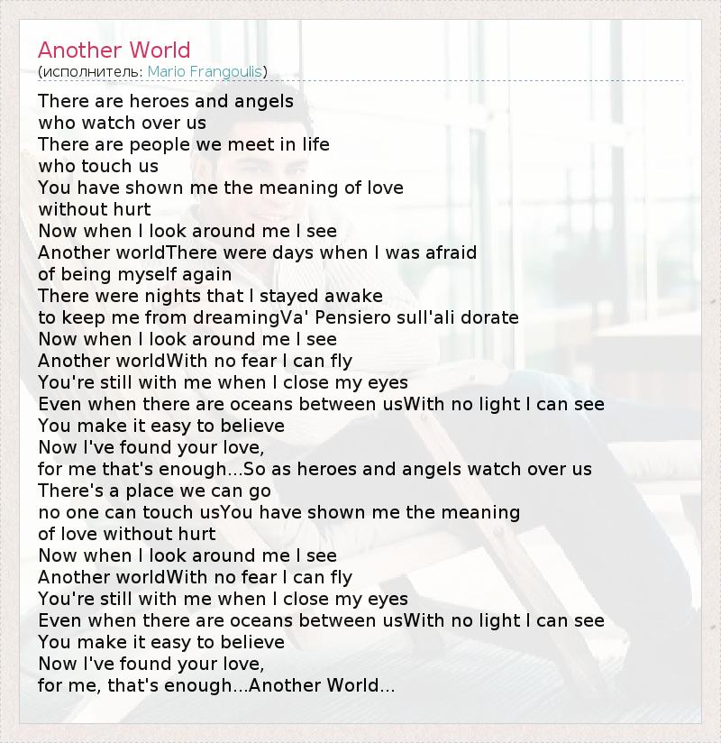 There are heroes and angels who watch over us There are people we meet in life who touch us You have shown me the meaning of love without hurt Now when I look around me I see Another worldThere were days when I was afraid of being myself again There were nights that I stayed awake to keep me from dreamingVa' Pensiero sull'ali dorate Now when I look around me I see Another worldWith no fear I can fly You're still with me when I close my eyes Even when there are oceans between usWith no light I can see You make it easy to believe Now I've found your love, for me that's enough...So as heroes and angels watch over us There's a place we can go no one can touch usYou have shown me the meaning of love without hurt Now when I look around me I see Another worldWith no fear I can fly You're still with me when I close my eyes Even when there are oceans between usWith no light I can see You make it easy to believe Now I've found your love, for me, that's enough...Another World...