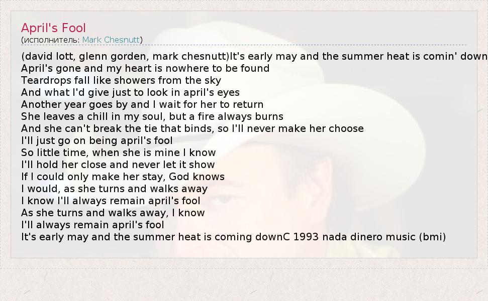 (david lott, glenn gorden, mark chesnutt)It's early may and the summer heat is comin' down