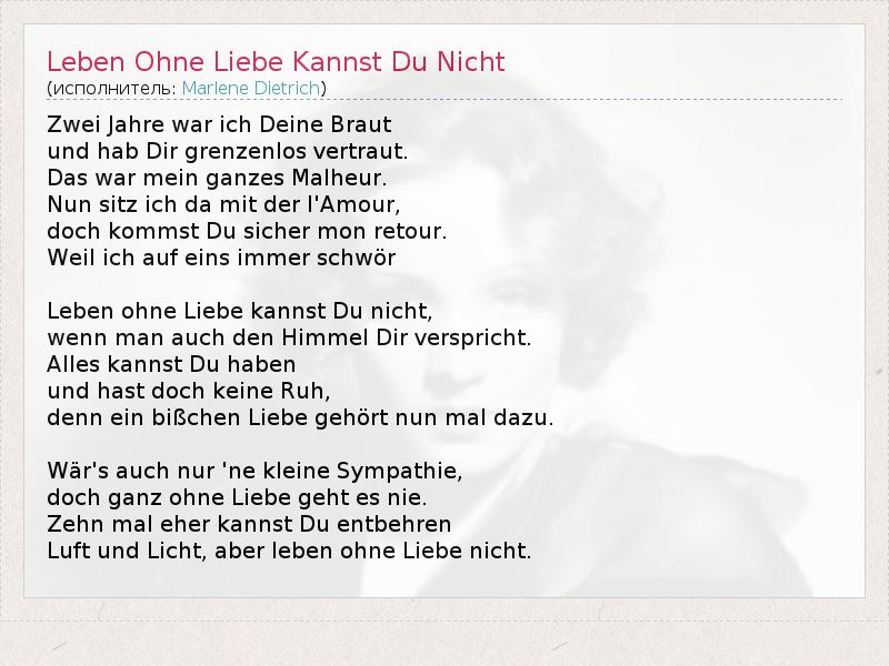 ГлавнаяИсполнителиMarlene DietrichLeben Ohne Liebe Kannst Du Nicht