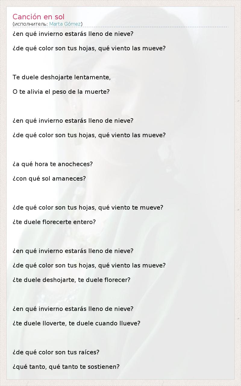¿en qué invierno estarás lleno de nieve? ¿de qué color son tus hojas, qué viento las mueve? Te duele deshojarte lentamente, O te alivia el peso de la muerte? ¿en qué invierno estarás lleno de nieve? ¿de qué color son tus hojas, qué viento las mueve? ¿a qué hora te anocheces? ¿con qué sol amaneces? ¿de qué color son tus hojas, qué viento te mueve? ¿te duele florecerte entero? ¿en qué invierno estarás lleno de nieve? ¿de qué color son tus hojas, qué viento las mueve? ¿te duele deshojarte, te duele florecer? ¿en qué invierno estarás lleno de nieve? ¿te duele lloverte, te duele cuando llueve? ¿de qué color son tus raíces? ¿qué tanto, qué tanto te sostienen?
