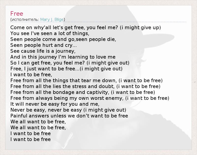 Come on why'all let's get free, you feel me? (i might give up) You see I've seen a lot of things, Seen people come and go,seen people die, Seen people hurt and cry... See cause life is a journey, And in this journey I'm learning to love me So I can get free, you feel me? (i might give out) Free, I just want to be free...(i might give out) I want to be free, Free from all the things that tear me down, (i want to be free) Free from all the lies the stress and doubt, (i want to be free) Free from all the bondage and captivity, (i want to be free) Free from always being my own worst enemy, (i want to be free) It will never be easy for you and me, Never be easy, never be easy (i might give out) Painful answers unless we don't want to be free We all want to be free, We all want to be free, I want to be free I want to be free
