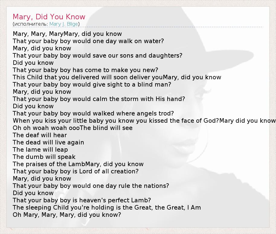 Mary, Mary, MaryMary, did you know That your baby boy would one day walk on water? Mary, did you know That your baby boy would save our sons and daughters? Did you know That your baby boy has come to make you new? This Child that you delivered will soon deliver youMary, did you know That your baby boy would give sight to a blind man? Mary, did you know That your baby boy would calm the storm with His hand? Did you know That your baby boy would walked where angels trod? When you kiss your little baby you know you kissed the face of God?Mary did you know Oh oh woah woah oooThe blind will see The deaf will hear The dead will live again The lame will leap The dumb will speak The praises of the LambMary, did you know That your baby boy is Lord of all creation? Mary, did you know That your baby boy would one day rule the nations? Did you know That your baby boy is heaven's perfect Lamb? The sleeping Child you're holding is the Great, the Great, I Am Oh Mary, Mary, Mary, did you know?
