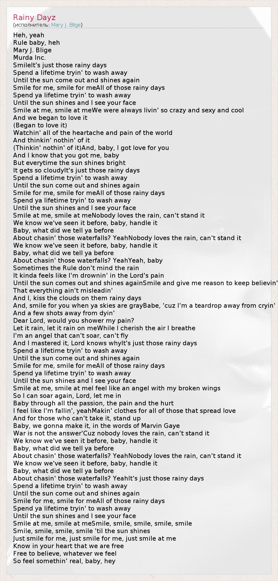 Heh, yeah Rule baby, heh Mary J. Blige Murda Inc. SmileIt's just those rainy days Spend a lifetime tryin' to wash away Until the sun come out and shines again Smile for me, smile for meAll of those rainy days Spend ya lifetime tryin' to wash away Until the sun shines and I see your face Smile at me, smile at meWe were always livin' so crazy and sexy and cool And we began to love it (Began to love it) Watchin' all of the heartache and pain of the world And thinkin' nothin' of it (Thinkin' nothin' of it)And, baby, I got love for you And I know that you got me, baby But everytime the sun shines bright It gets so cloudyIt's just those rainy days Spend a lifetime tryin' to wash away Until the sun come out and shines again Smile for me, smile for meAll of those rainy days Spend ya lifetime tryin' to wash away Until the sun shines and I see your face Smile at me, smile at meNobody loves the rain, can't stand it We know we've seen it before, baby, handle it Baby, what did we tell ya before About chasin' those waterfalls? YeahNobody loves the rain, can't stand it We know we've seen it before, baby, handle it Baby, what did we tell ya before About chasin' those waterfalls? YeahYeah, baby Sometimes the Rule don't mind the rain It kinda feels like I'm drownin' in the Lord's pain Until the sun comes out and shines againSmile and give me reason to keep believin' That everything ain't misleadin' And I, kiss the clouds on them rainy days And, smile for you when ya skies are grayBabe, 'cuz I'm a teardrop away from cryin' And a few shots away from dyin' Dear Lord, would you shower my pain? Let it rain, let it rain on meWhile I cherish the air I breathe I'm an angel that can't soar, can't fly And I mastered it, Lord knows whyIt's just those rainy days Spend a lifetime tryin' to wash away Until the sun come out and shines again Smile for me, smile for meAll of those rainy days Spend ya lifetime tryin' to wash away Until the sun shines and I see your face Smile at me, smile at meI feel like an angel with my broken wings So I can soar again, Lord, let me in Baby through all the passion, the pain and the hurt I feel like I'm fallin', yeahMakin' clothes for all of those that spread love And for those who can't take it, stand up Baby, we gonna make it, in the words of Marvin Gaye War is not the answer'Cuz nobody loves the rain, can't stand it We know we've seen it before, baby, handle it Baby, what did we tell ya before About chasin' those waterfalls? YeahNobody loves the rain, can't stand it We know we've seen it before, baby, handle it Baby, what did we tell ya before About chasin' those waterfalls? YeahIt's just those rainy days Spend a lifetime tryin' to wash away Until the sun come out and shines again Smile for me, smile for meAll of those rainy days Spend ya lifetime tryin' to wash away Until the sun shines and I see your face Smile at me, smile at meSmile, smile, smile, smile, smile Smile, smile, smile, smile 'til the sun shines Just smile for me, just smile for me, just smile at me Know in your heart that we are free Free to believe, whatever we feel So feel somethin' real, baby, hey