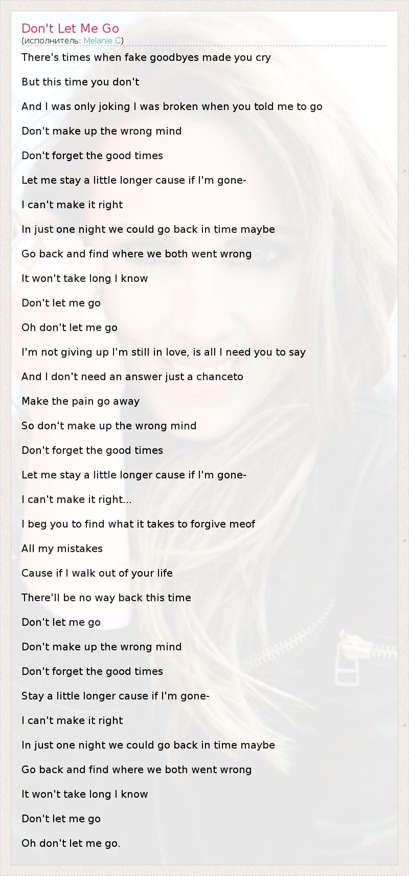 There's times when fake goodbyes made you cry But this time you don't And I was only joking I was broken when you told me to go Don't make up the wrong mind Don't forget the good times Let me stay a little longer cause if I'm gone- I can't make it right In just one night we could go back in time maybe Go back and find where we both went wrong It won't take long I know Don't let me go Oh don't let me go I'm not giving up I'm still in love, is all I need you to say And I don't need an answer just a chanceto Make the pain go away So don't make up the wrong mind Don't forget the good times Let me stay a little longer cause if I'm gone- I can't make it right... I beg you to find what it takes to forgive meof All my mistakes Cause if I walk out of your life There'll be no way back this time Don't let me go Don't make up the wrong mind Don't forget the good times Stay a little longer cause if I'm gone- I can't make it right In just one night we could go back in time maybe Go back and find where we both went wrong It won't take long I know Don't let me go Oh don't let me go.