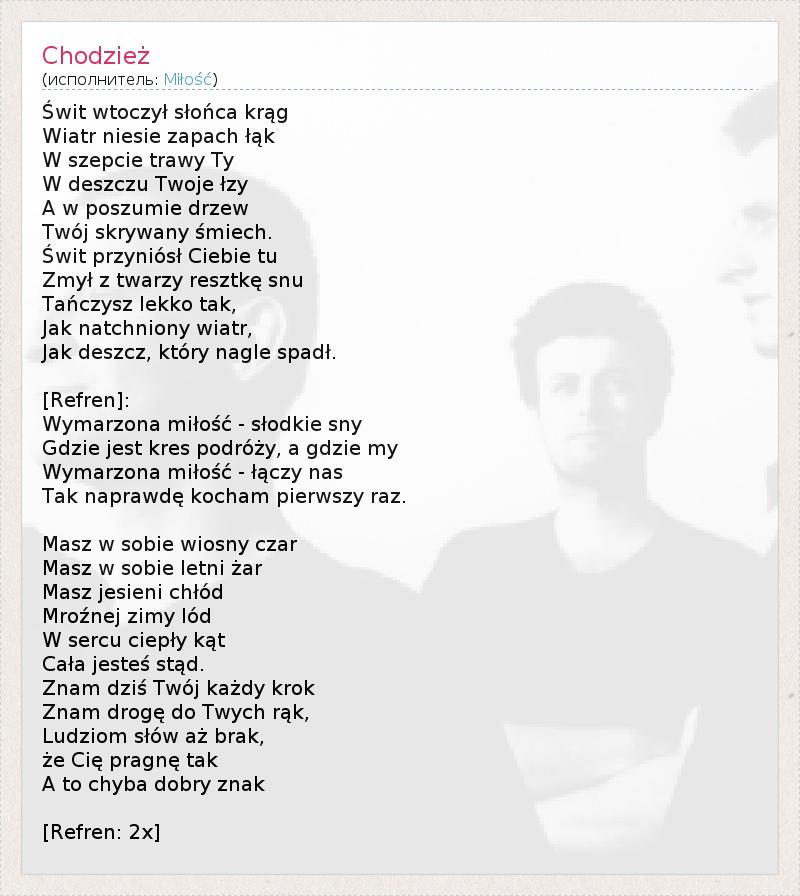 Świt wtoczył słońca krąg Wiatr niesie zapach łąk W szepcie trawy Ty W deszczu Twoje łzy A w poszumie drzew Twój skrywany śmiech. Świt przyniósł Ciebie tu Zmył z twarzy resztkę snu Tańczysz lekko tak, Jak natchniony wiatr, Jak deszcz, który nagle spadł. [Refren]: Wymarzona miłość - słodkie sny Gdzie jest kres podróży, a gdzie my Wymarzona miłość - łączy nas Tak naprawdę kocham pierwszy raz. Masz w sobie wiosny czar Masz w sobie letni żar Masz jesieni chłód Mroźnej zimy lód W sercu ciepły kąt Cała jesteś stąd. Znam dziś Twój każdy krok Znam drogę do Twych rąk, Ludziom słów aż brak, że Cię pragnę tak A to chyba dobry znak [Refren: 2x]