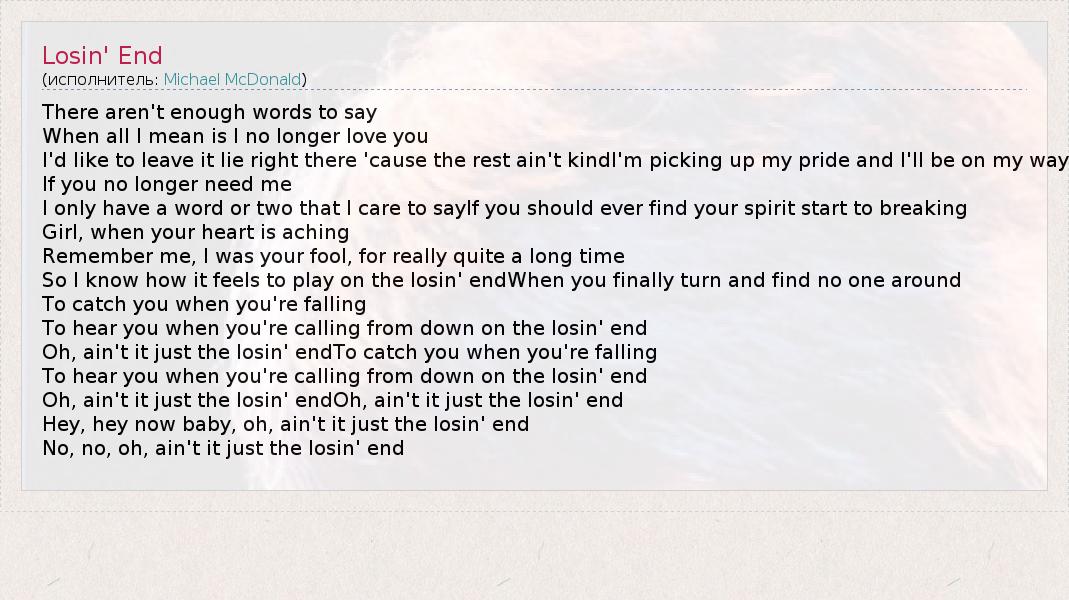 Это интересно:Соул- и ритм-н-блюз-певец Майкл Макдональд родился 12 февраля 1952-го в Сент-Луисе, штат Миссури. Его альбомы по числу продаж добивались 'золотого' и 'платинового' статусов. Иногда Майкла называют 'голубоглазым соул-исполнителем' и его отличительный 'певчий знак' – это 'хриплый, душевный' диапазон баритона. Он известен по своей работе в составе американских рок-групп... продолжение