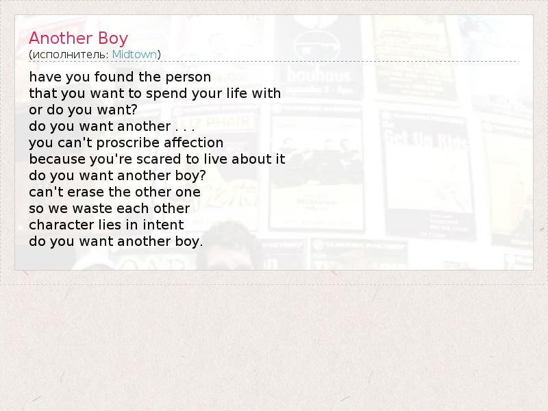 have you found the person that you want to spend your life with or do you want? do you want another . . . you can't proscribe affection because you're scared to live about it do you want another boy? can't erase the other one so we waste each other character lies in intent do you want another boy.