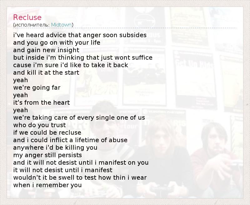 i've heard advice that anger soon subsides and you go on with your life and gain new insight but inside i'm thinking that just wont suffice cause i'm sure i'd like to take it back and kill it at the start yeah we're going far yeah it's from the heart yeah we're taking care of every single one of us who do you trust if we could be recluse and i could inflict a lifetime of abuse anywhere i'd be killing you my anger still persists and it will not desist until i manifest on you it will not desist until i manifest wouldn't it be swell to test how thin i wear when i remember you