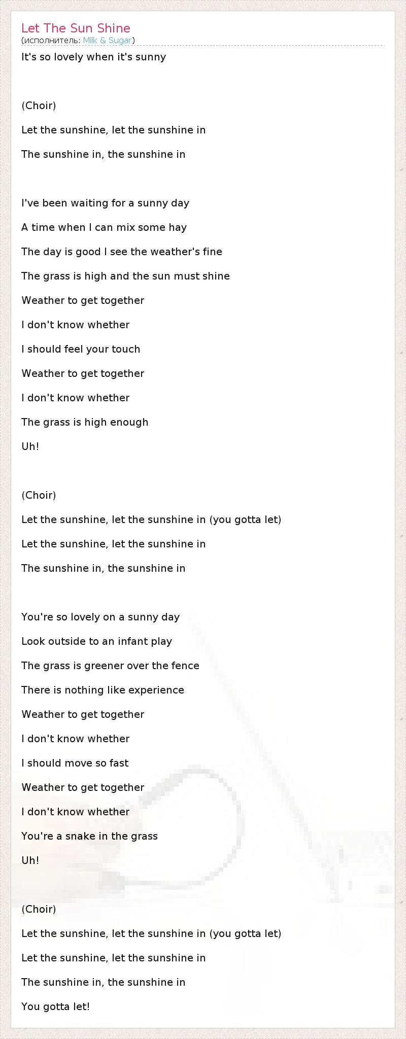 It's so lovely when it's sunny (Choir) Let the sunshine, let the sunshine in The sunshine in, the sunshine in I've been waiting for a sunny day A time when I can mix some hay The day is good I see the weather's fine The grass is high and the sun must shine Weather to get together I don't know whether I should feel your touch Weather to get together I don't know whether The grass is high enough Uh! (Choir) Let the sunshine, let the sunshine in (you gotta let) Let the sunshine, let the sunshine in The sunshine in, the sunshine in You're so lovely on a sunny day Look outside to an infant play The grass is greener over the fence There is nothing like experience Weather to get together I don't know whether I should move so fast Weather to get together I don't know whether You're a snake in the grass Uh! (Choir) Let the sunshine, let the sunshine in (you gotta let) Let the sunshine, let the sunshine in The sunshine in, the sunshine in You gotta let!