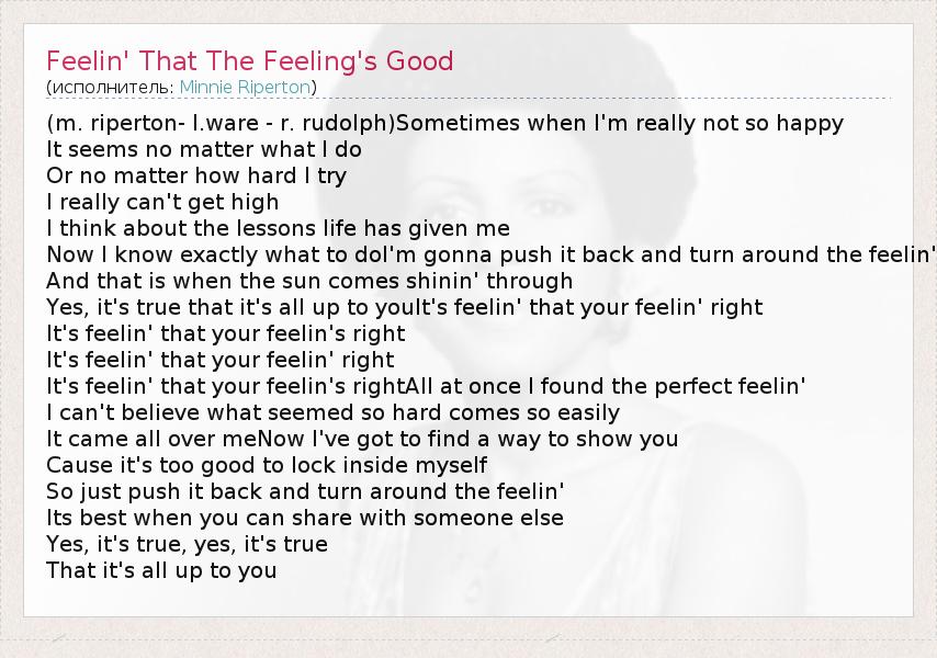 ГлавнаяИсполнителиMinnie RipertonFeelin' That The Feeling's Good