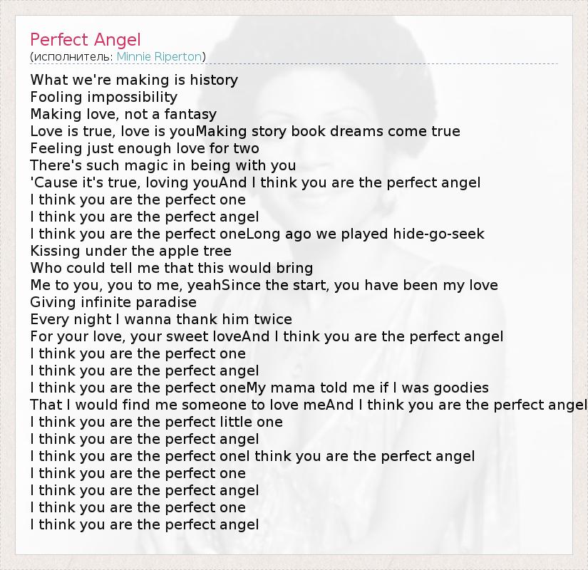 What we're making is history Fooling impossibility Making love, not a fantasy Love is true, love is youMaking story book dreams come true Feeling just enough love for two There's such magic in being with you 'Cause it's true, loving youAnd I think you are the perfect angel I think you are the perfect one I think you are the perfect angel I think you are the perfect oneLong ago we played hide-go-seek Kissing under the apple tree Who could tell me that this would bring Me to you, you to me, yeahSince the start, you have been my love Giving infinite paradise Every night I wanna thank him twice For your love, your sweet loveAnd I think you are the perfect angel I think you are the perfect one I think you are the perfect angel I think you are the perfect oneMy mama told me if I was goodies That I would find me someone to love meAnd I think you are the perfect angel I think you are the perfect little one I think you are the perfect angel I think you are the perfect oneI think you are the perfect angel I think you are the perfect one I think you are the perfect angel I think you are the perfect one I think you are the perfect angel