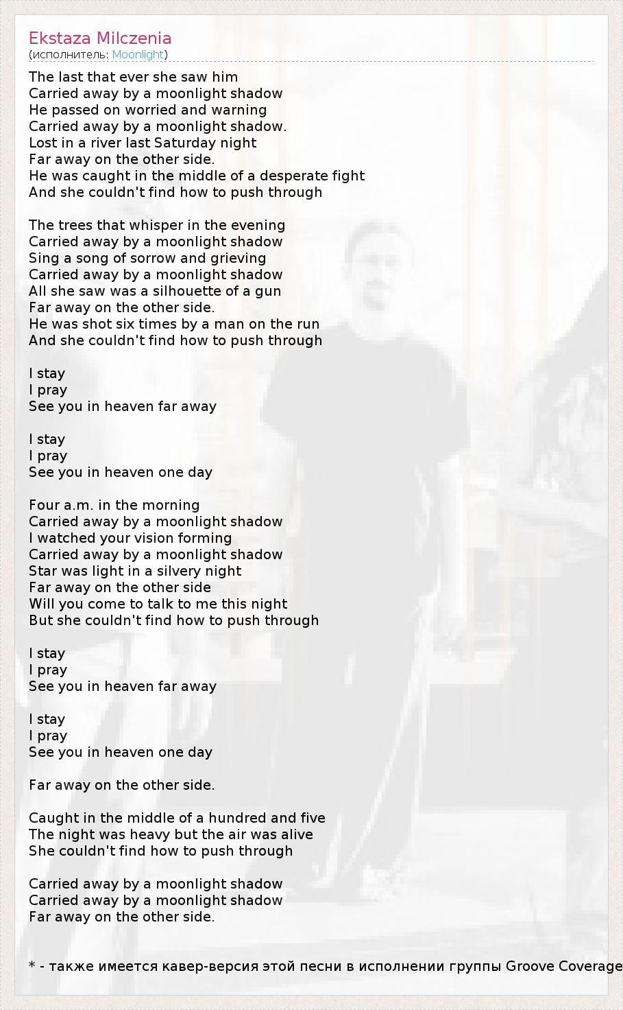 The last that ever she saw him Carried away by a moonlight shadow He passed on worried and warning Carried away by a moonlight shadow. Lost in a river last Saturday night Far away on the other side. He was caught in the middle of a desperate fight And she couldn't find how to push through The trees that whisper in the evening Carried away by a moonlight shadow Sing a song of sorrow and grieving Carried away by a moonlight shadow All she saw was a silhouette of a gun Far away on the other side. He was shot six times by a man on the run And she couldn't find how to push through I stay I pray See you in heaven far away I stay I pray See you in heaven one day Four a.m. in the morning Carried away by a moonlight shadow I watched your vision forming Carried away by a moonlight shadow Star was light in a silvery night Far away on the other side Will you come to talk to me this night But she couldn't find how to push through I stay I pray See you in heaven far away I stay I pray See you in heaven one day Far away on the other side. Caught in the middle of a hundred and five The night was heavy but the air was alive She couldn't find how to push through Carried away by a moonlight shadow Carried away by a moonlight shadow Far away on the other side. * - также имеется кавер-версия этой песни в исполнении группы Groove Coverage