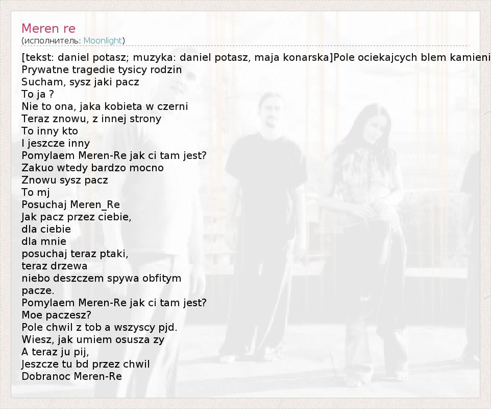 [tekst: daniel potasz; muzyka: daniel potasz, maja konarska]Pole ociekajcych blem kamieni Prywatne tragedie tysicy rodzin Sucham, sysz jaki pacz To ja ? Nie to ona, jaka kobieta w czerni Teraz znowu, z innej strony To inny kto I jeszcze inny Pomylaem Meren-Re jak ci tam jest? Zakuo wtedy bardzo mocno Znowu sysz pacz To mj Posuchaj Meren_Re Jak pacz przez ciebie, dla ciebie dla mnie posuchaj teraz ptaki, teraz drzewa niebo deszczem spywa obfitym pacze. Pomylaem Meren-Re jak ci tam jest? Moe paczesz? Pole chwil z tob a wszyscy pjd. Wiesz, jak umiem osusza zy A teraz ju pij, Jeszcze tu bd przez chwil Dobranoc Meren-Re