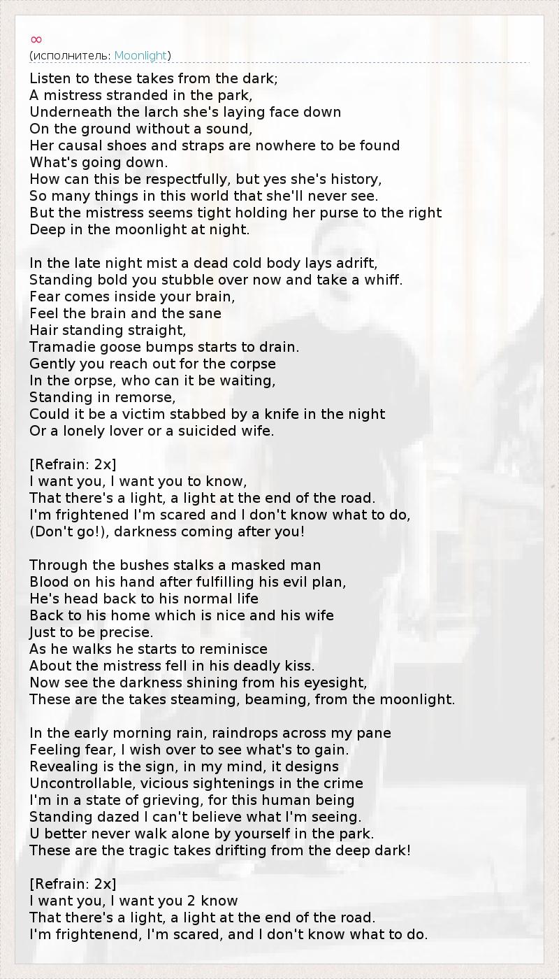 Прислушайтесь к кинокадрам из темноты: Прекрасная девушка попала в беду в парке, Она лежит под лиственницей лицом вниз, На холодной земле и не издаёт ни звука. Её туфли с ремешками никто не найдёт, Что здесь произошло? Пусть это не слишком почтительно, но она уже не встанет, Так много всего в этом мире она уже не увидит, Но девушка окоченевшей хваткой держит свой кошелёк, Залитая лунным светом глубокой ночью. В тумане поздней ночи лежит холодный труп. Набравшись смелости, ты подходишь и принюхиваешься... Страх закрадывается в твой мозг, Но ты чувствуешь трезвость ума, Пусть волосы встают дыбом И мурашки по коже... Осторожно протягиваешь руку к трупу. Кого она может ждать, Терзаемая угрызениями совести? Может, она жертва острого клинка, Или брошенная влюблённая, или чья-то жена, покончившая собой. [Припев: 2 раза] Я хочу, чтобы ты, хочу, чтоб ты знала, Что есть свет, свет в конце туннеля. Я напуган, я в ужасе и не знаю, что мне делать, (Не уходи!), тьма идёт вслед за тобой! Сквозь кусты пробирается незнакомец в маске, Кровь на руках свидетельствует о выполнении его злого намерения. В мыслях он уже вернулся к обычной жизни, Вернулся к своему ухоженному дому, к своей жене, Просто чтобы быть последовательным. Возвращаясь, он вспоминает О девушке, что погубил его смертельный поцелуй. Взгляни теперь на темноту, сияющую в его глазницах: В ней отражаются картины злости в лунном свете. Рано утром дождь каплями постучится в моё окно, Чувствуя страх, я хотел бы понять, какую извлечь из этого пользу. Разоблачение - это знак, в моей голове он рисует Неконтролируемое, порочное видение преступления. Я скорблю об этом человеческом существе, Шокированный, я не могу поверить в то, что вижу. Лучше никогда не гуляй в парке одна - Эти трагические эпизоды рождаются в глубине тьмы! [Припев: 2 раза] Я хочу, чтобы ты, хочу, чтоб ты знала, Что есть свет, свет в конце туннеля. Я напуган, я в ужасе и не знаю, что мне делать...